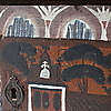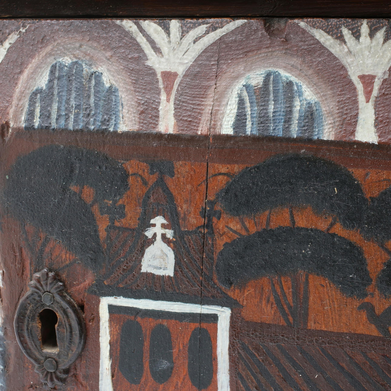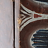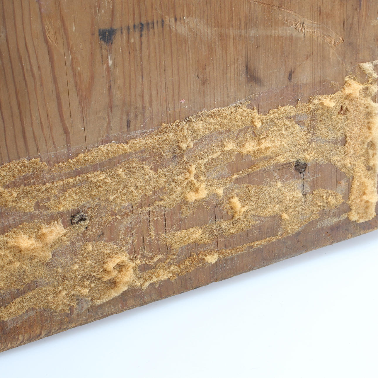 Bruksslitage, fläckar, senare bemålat, sprickor/skador, troligen någon form av skumgummirester på baksida.
