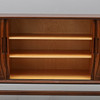 På benställning, två par skjutdörrar med bakomliggande hyllplan samt fyra draglådor. Höjd ca 110, bredd 190 samt djup ca 45 cm.