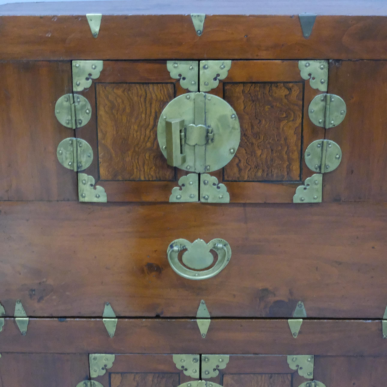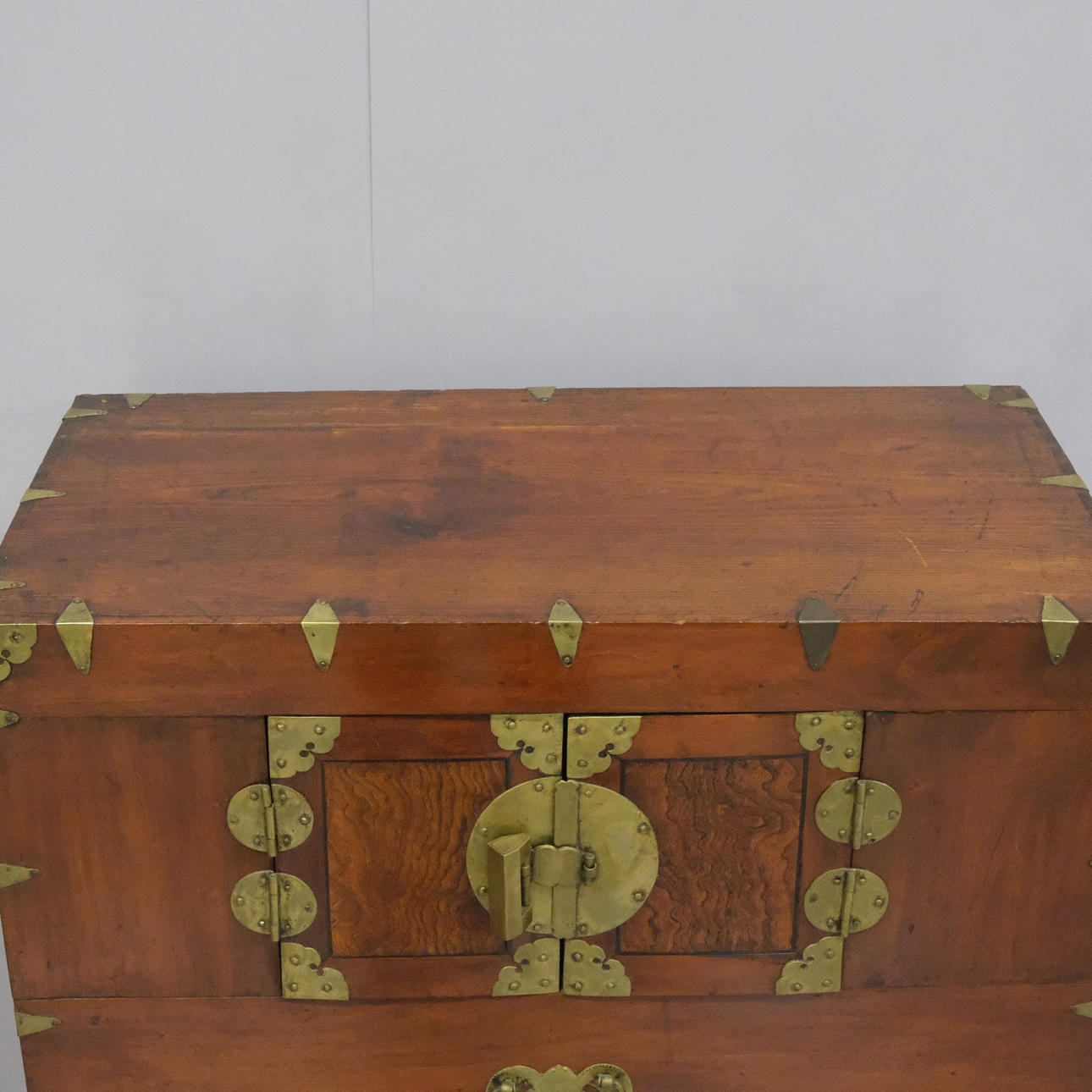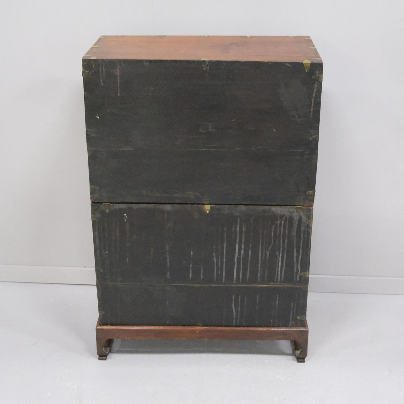 Kinaskåp i två delar på sockel, mässingsdetaljer, höjd 104cm, längd 68cm, bredd 36cm, nycklar och lås finns.