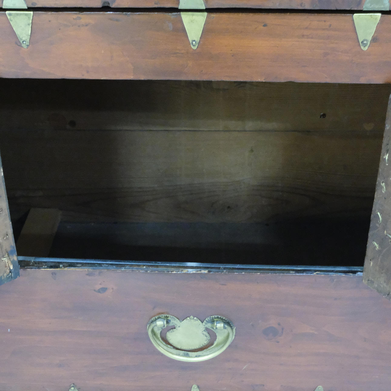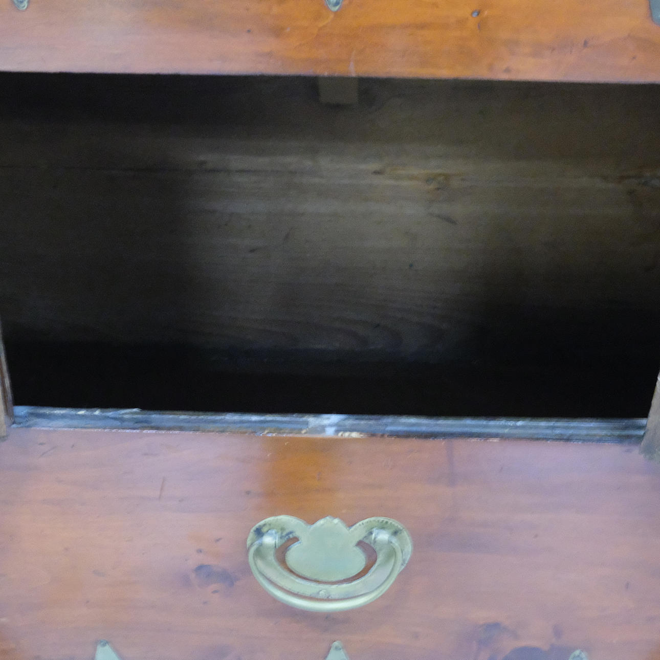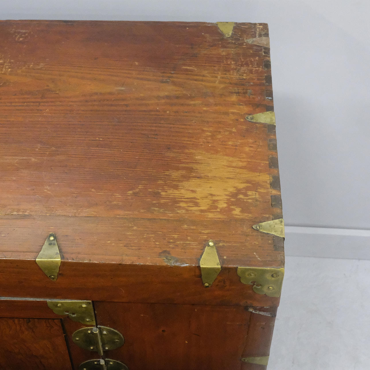 Kinaskåp i två delar på sockel, mässingsdetaljer, höjd 104cm, längd 68cm, bredd 36cm, nycklar och lås finns.
