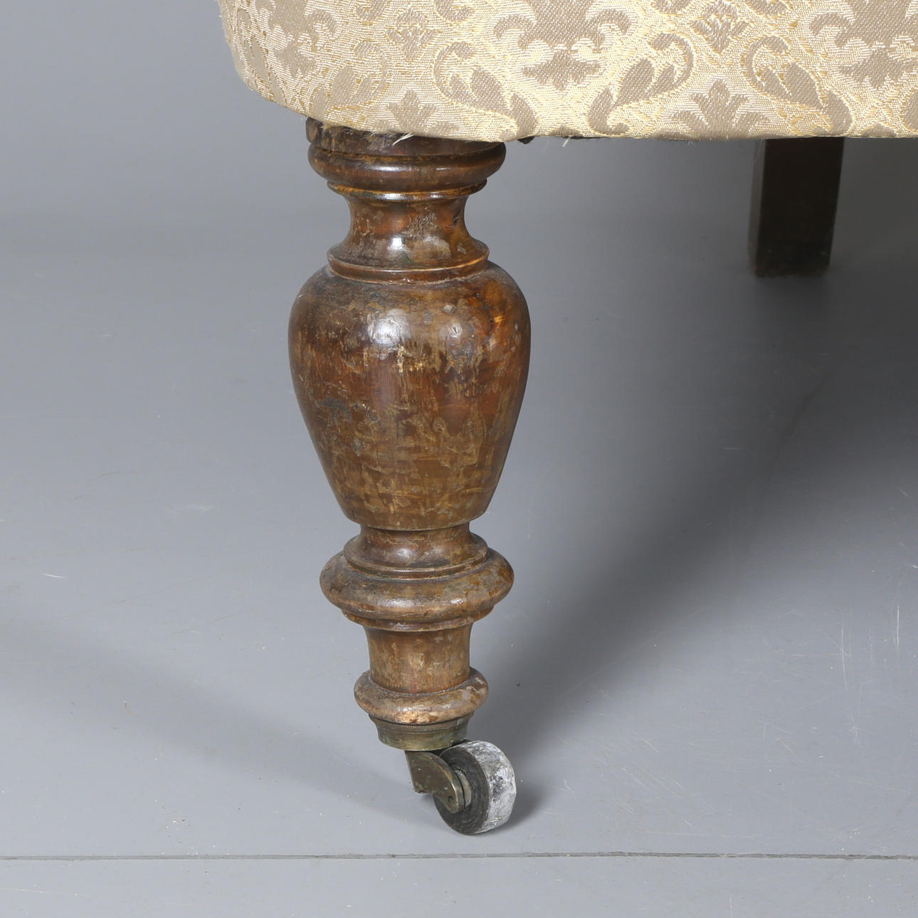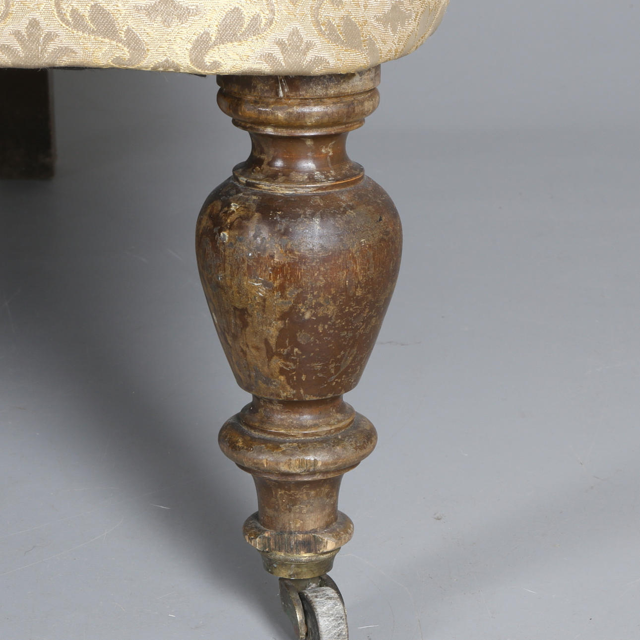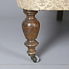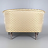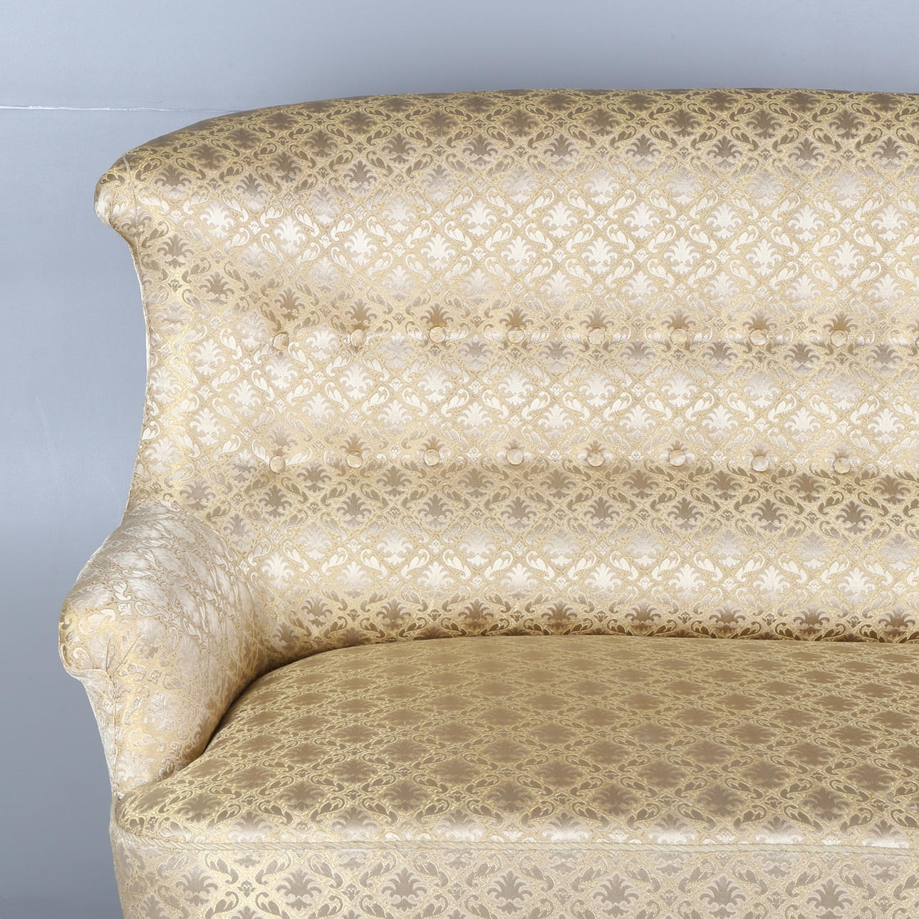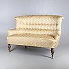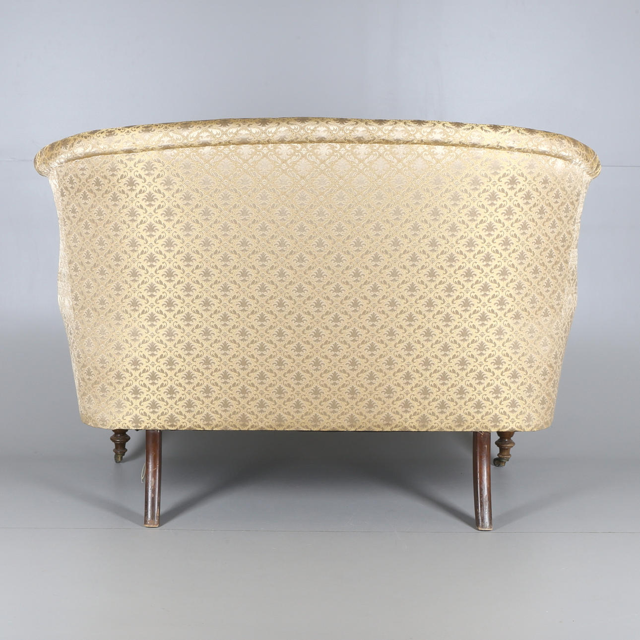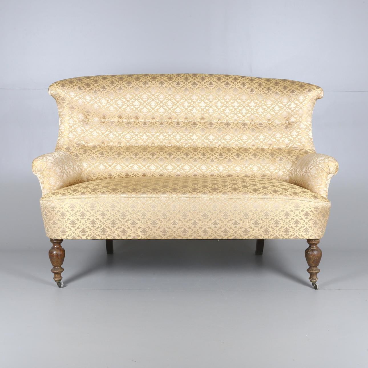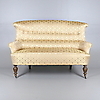 Klädd i guldfärgat- tyg med geometriskt mönster i form av rankor/blomster. Framben på hjultrissor. Sitthöjd 45 cm. Längd ca 145 cm.