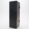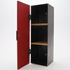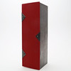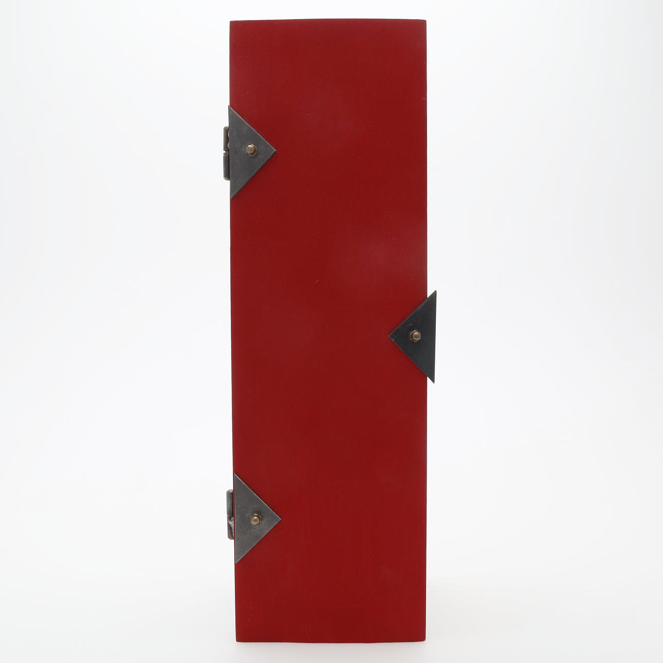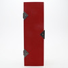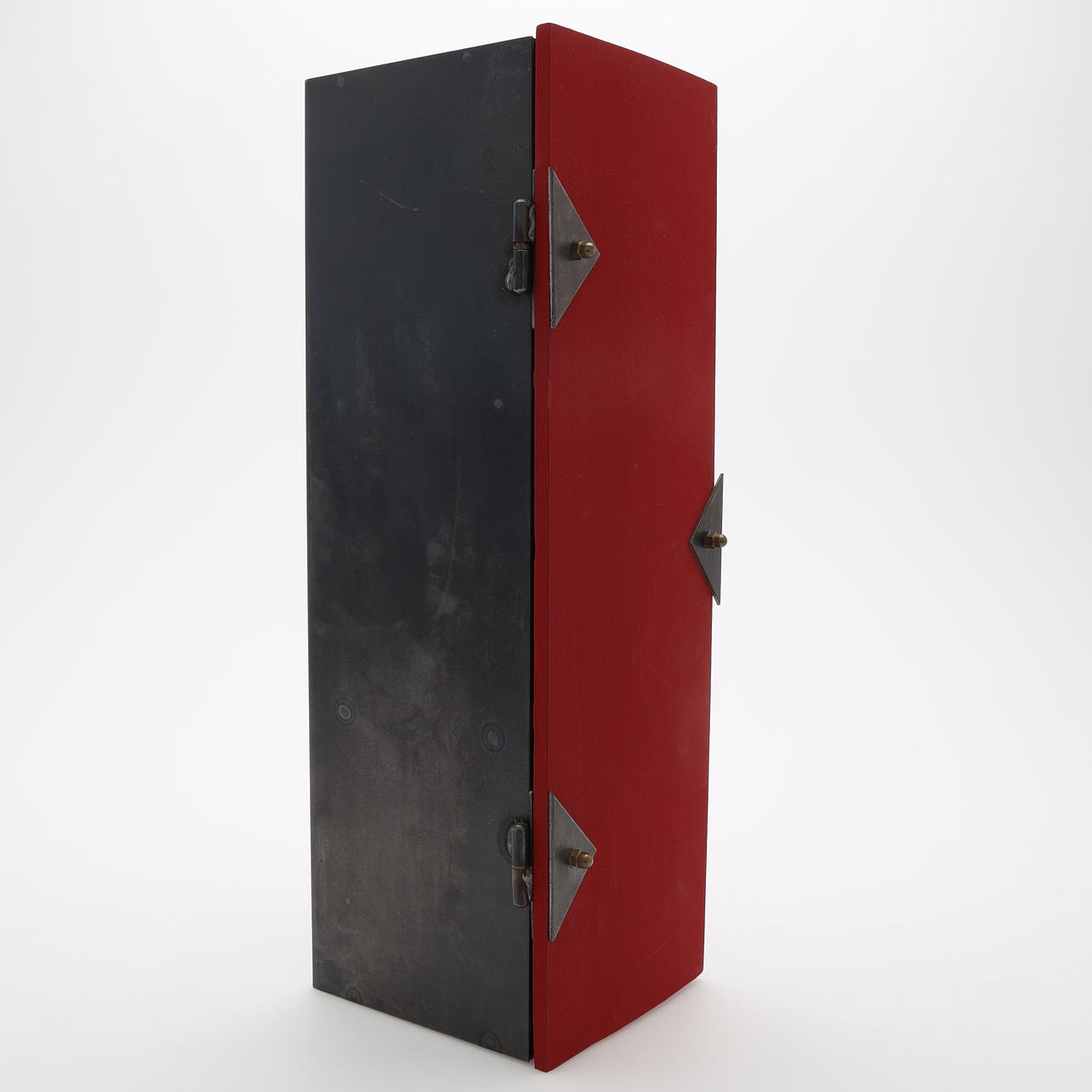 Stålstomme, trädörr bemålad röd, beslag i stål fäst med muttrar.