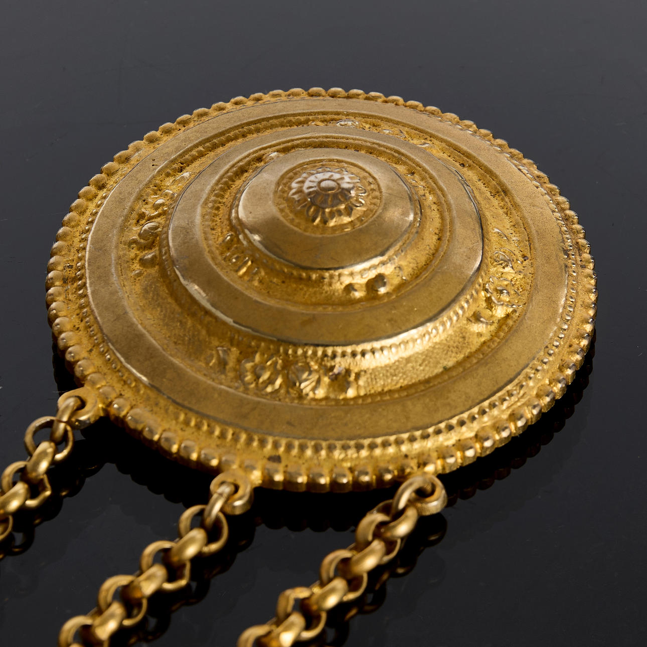 3195542. DRÄKTSMYCKE, förgylld mässing.
