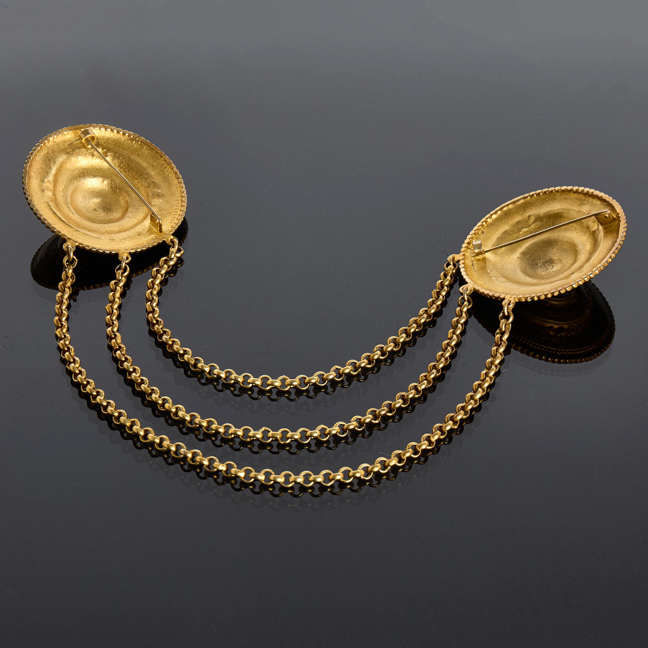 2 broscher, med sammanlänkande kedjor. Diameter ca 6 cm vardera.