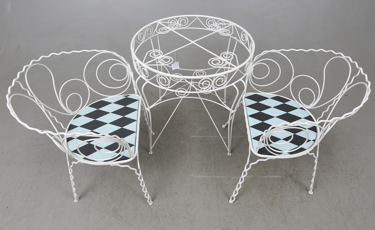 Bemålad smide. Diameter på bord 72 cm.