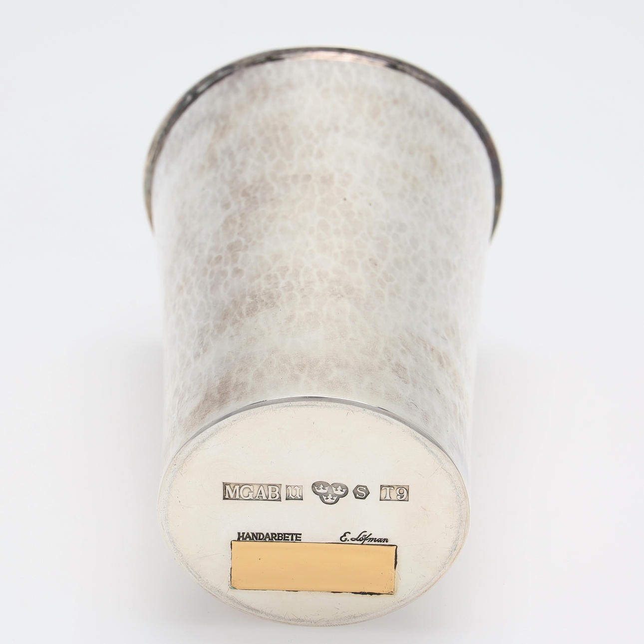 Vas / bägare i silver, hamrad yta. Stämplad E. Löfman, MGAB (Markströms Guldsmeds AB K G).