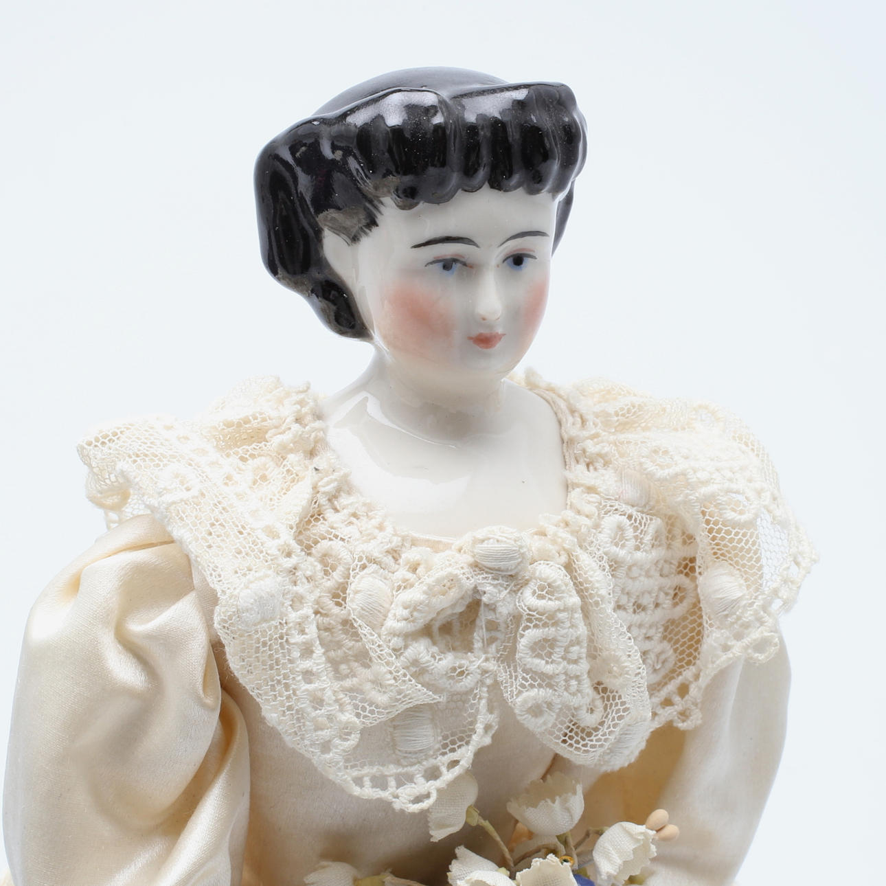 Docka i vit klänning med huvud/överkropp i porslin och händer i plastmassa, höjd 27,5 cm