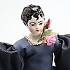 Docka i blå klänning med huvud/överkropp och händer/ben i flintgods, höjd 24 cm.