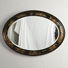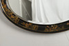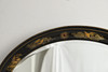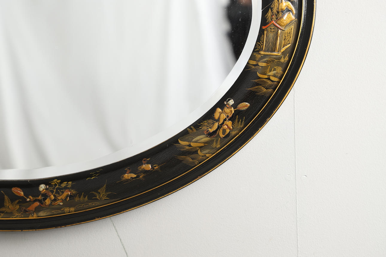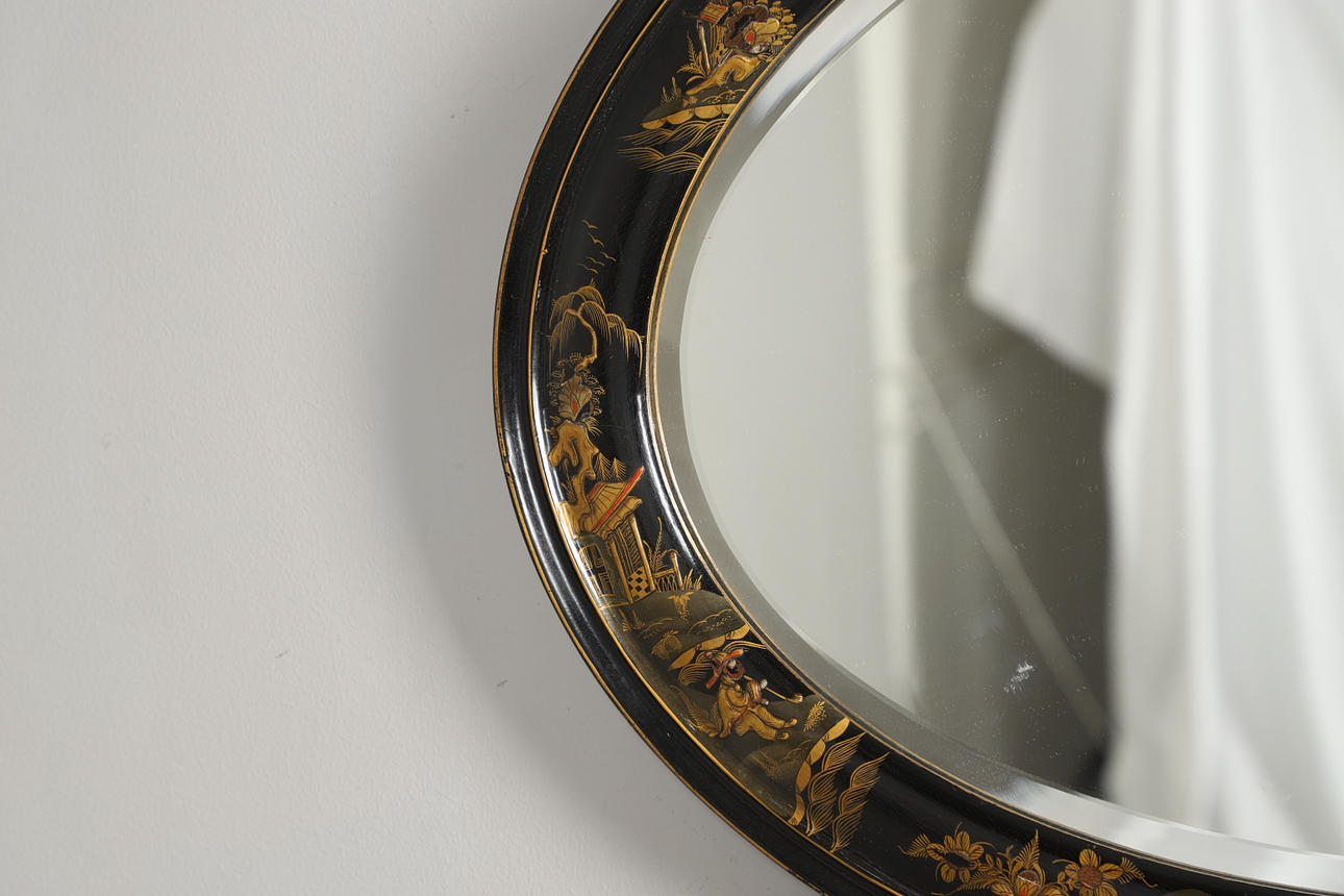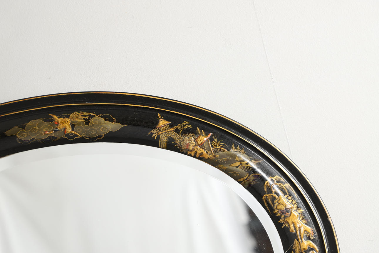 Svartlackad träram med Chinoiserie-dekoration och en oval fasad spegelplatta. 88 cm x 63 cm.