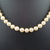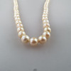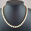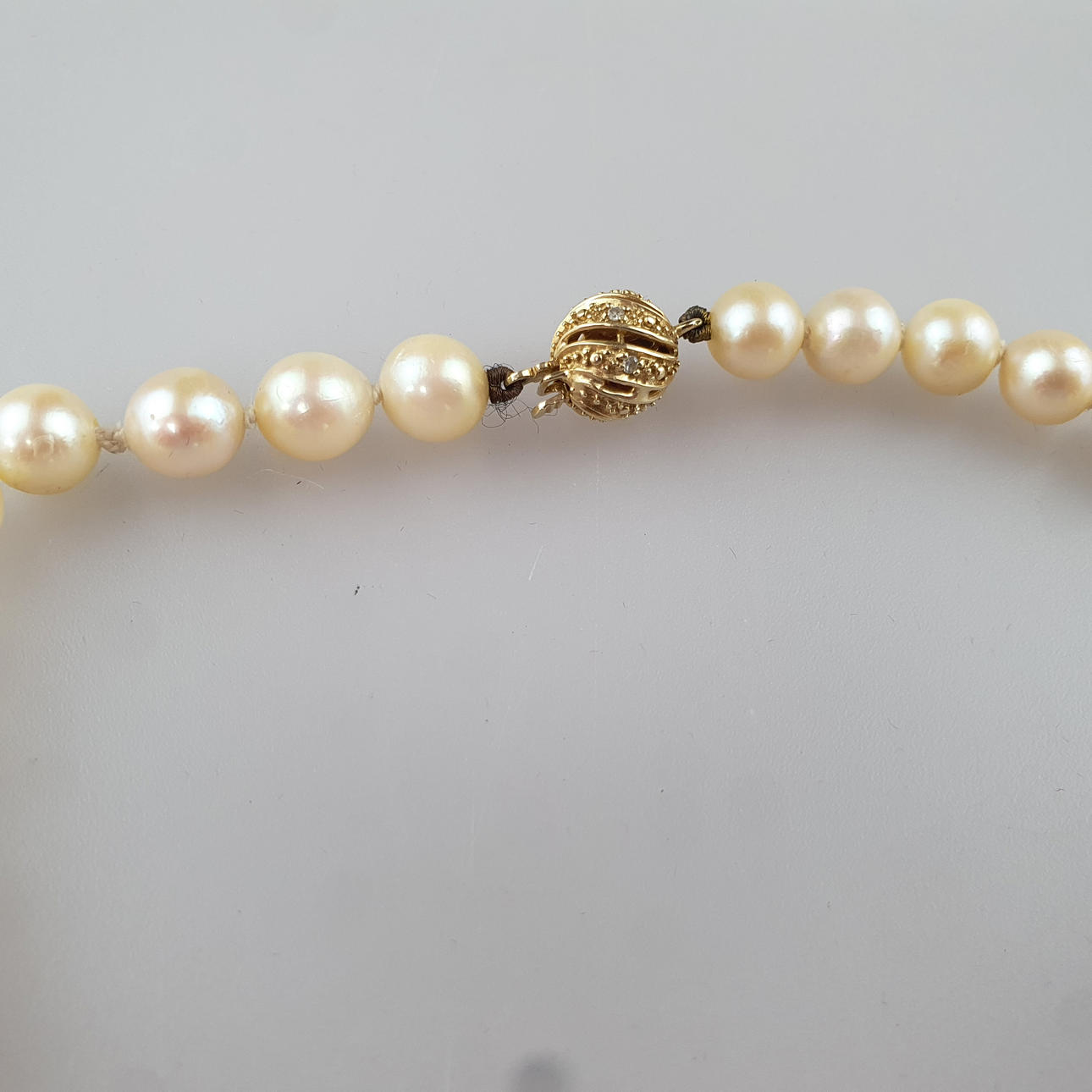 enradigt halsband av 56 odlade pärlor med guldfärgad ljuskrona (diameter 6 - 7 mm), genombrutet kullås i gult guld, med granuleringsdekoration och 6 små åttkantslipade diamanter, stämplade ”585”, längd ca. 46 cm, totalvikt ca. 32 g.