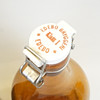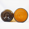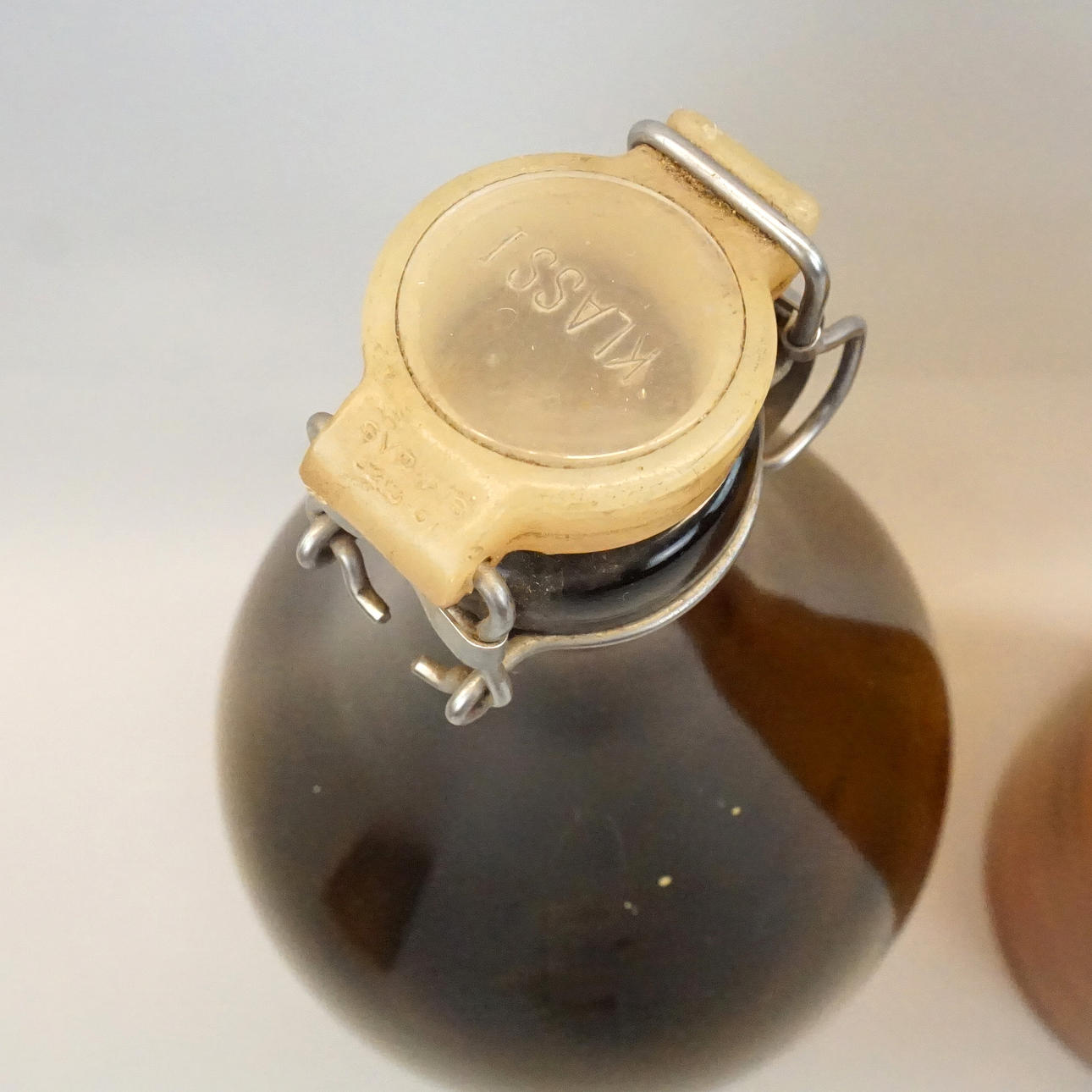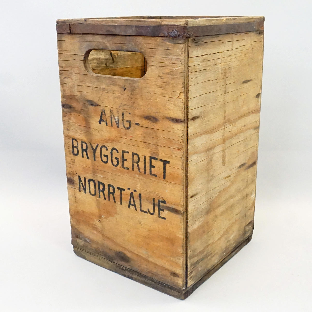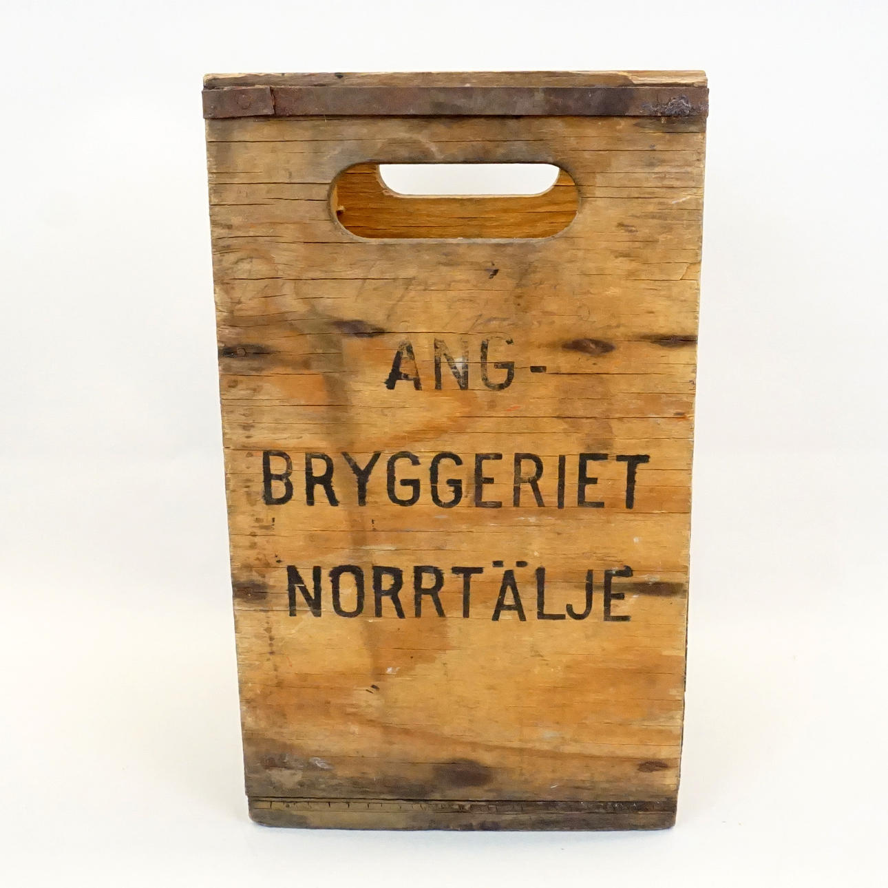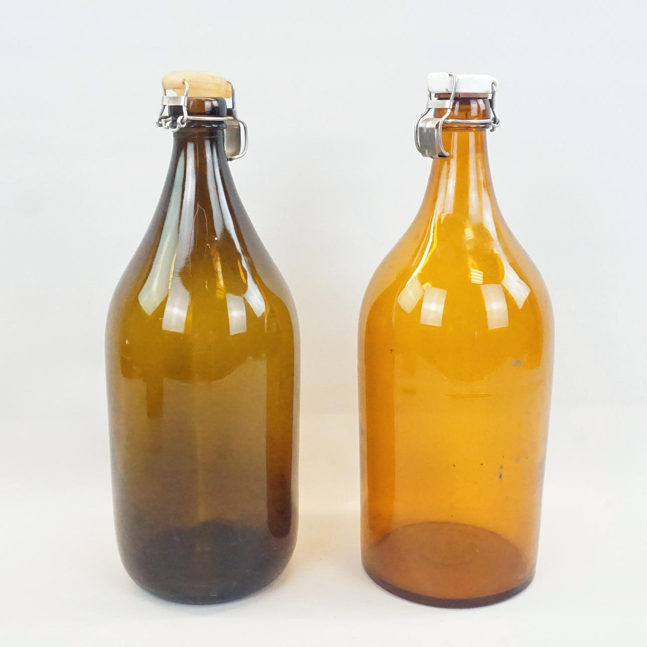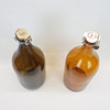 2 st flaskor, bruntonat glas, höjd inkl lock ca 44 cm. En ställning i trä från Norrtälje Bryggeri medföljer.