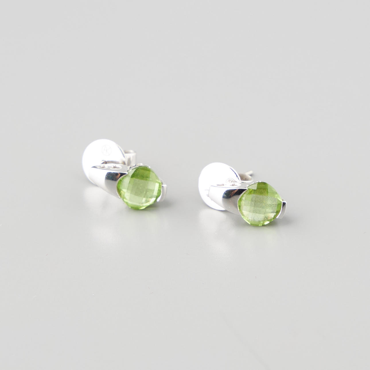 Peridoter 7 x 7 mm. örhängenas höjd 12 mm. Vikt totalt ca 3,9 g.
