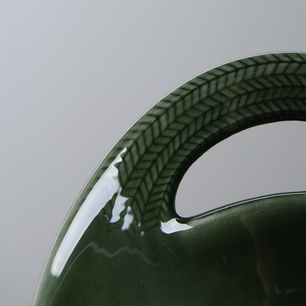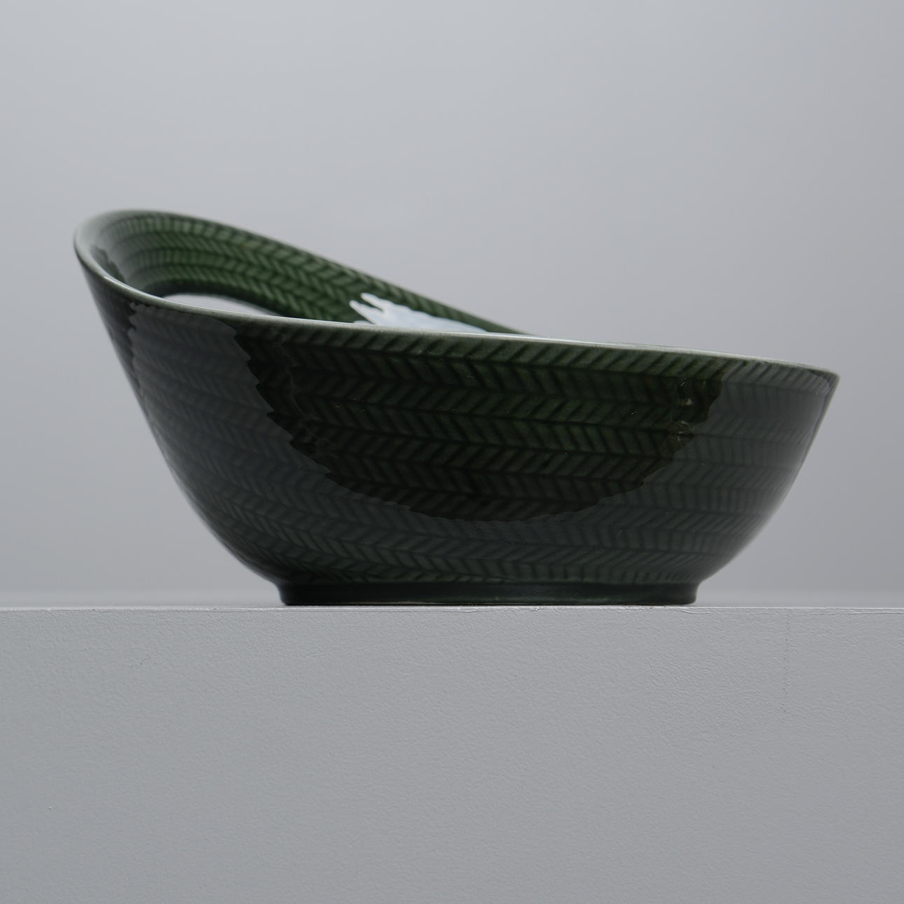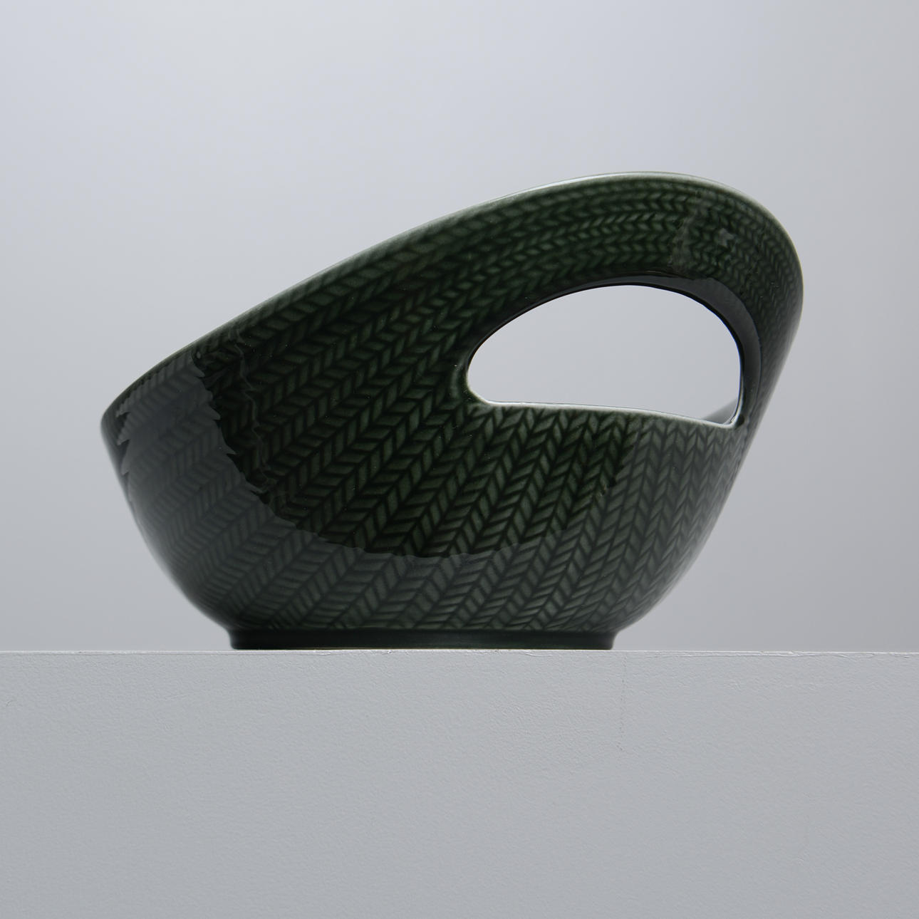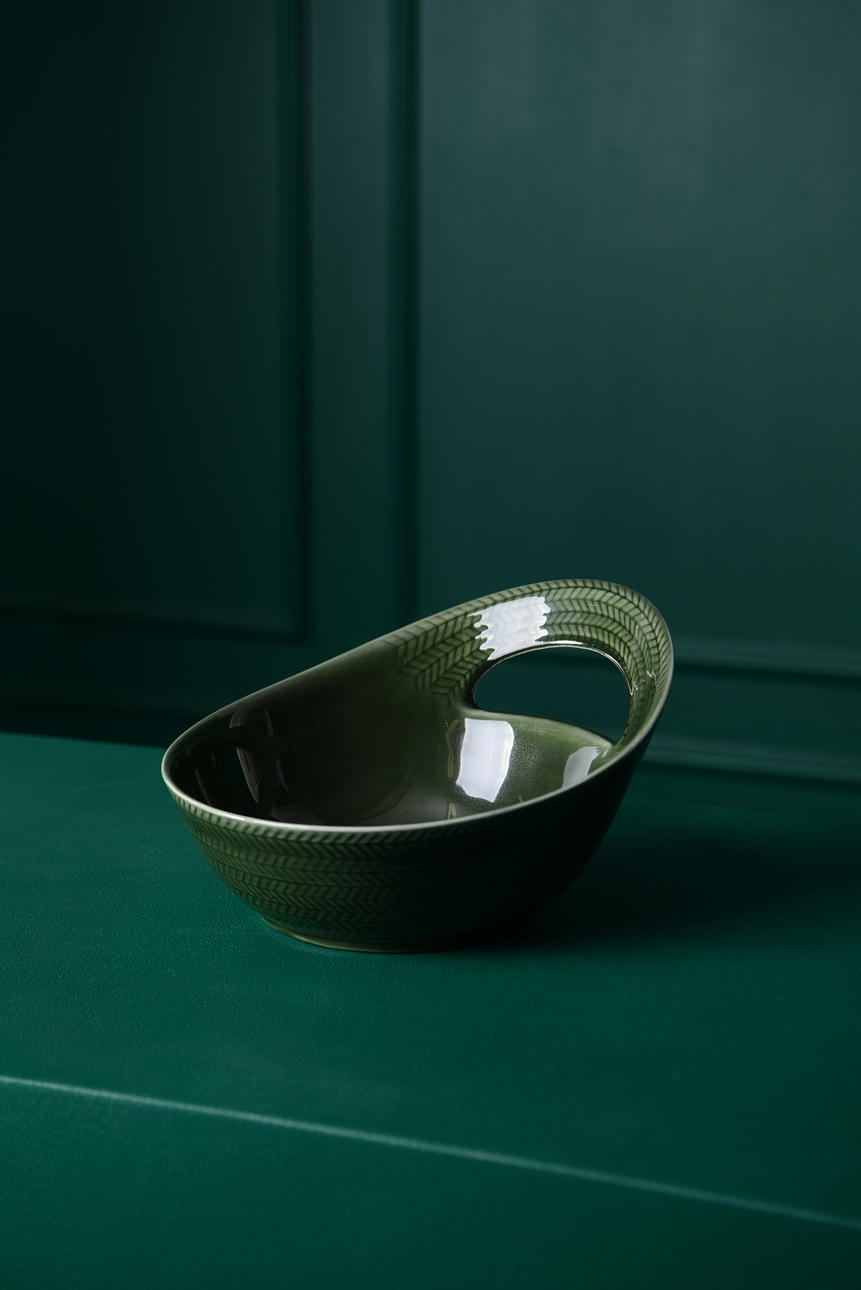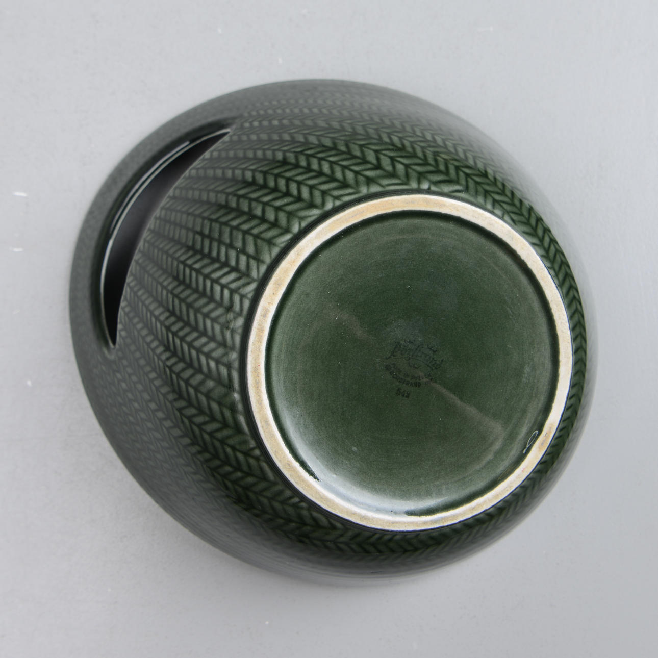 Skål med hänkel, glaserad i grönt. Stämpelmärkt med Rörstrand logga samt 542.