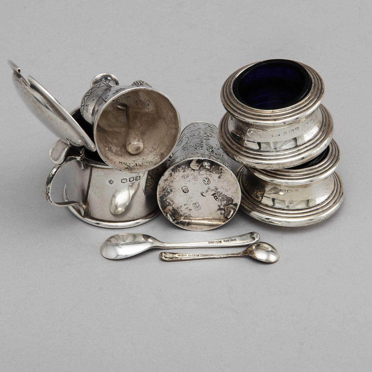 1 par saltkar med glasinsats, senapskanna med glasinsats, ströare, bordsklocka.
