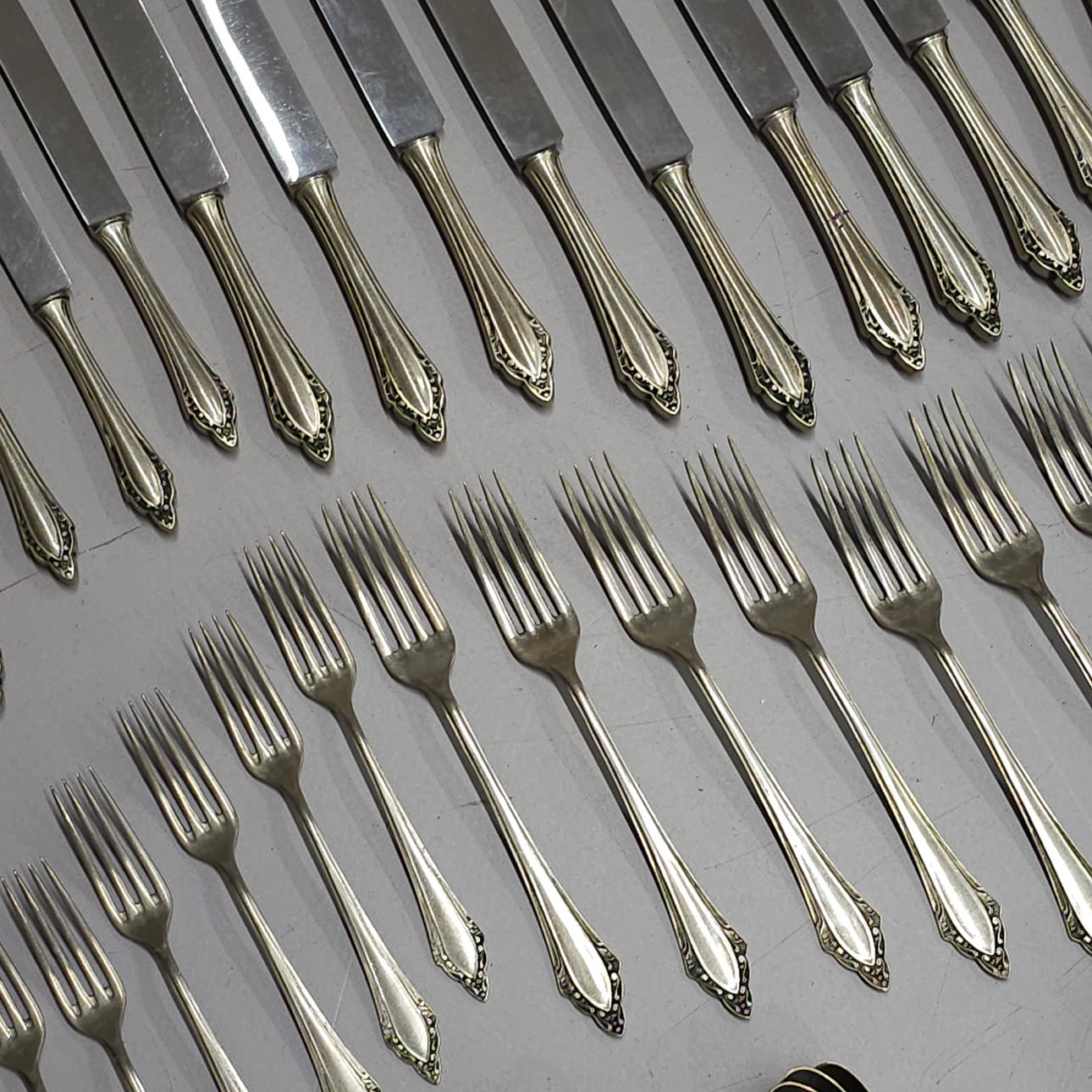 3210145. ANTIK FÖRSILVRAD ALPACKA BESTICK. 81 BITAR.
