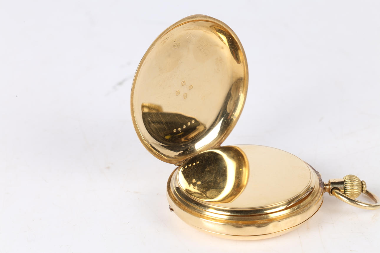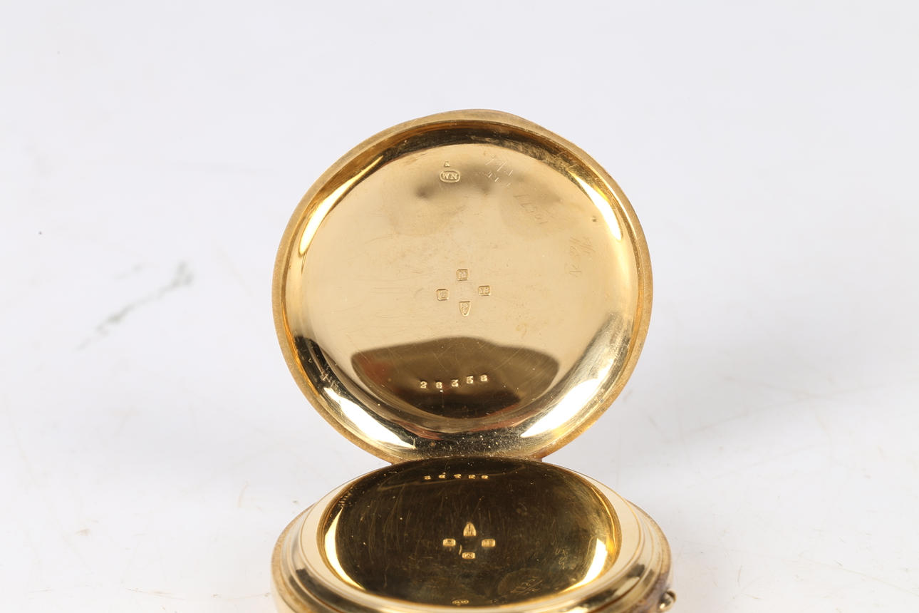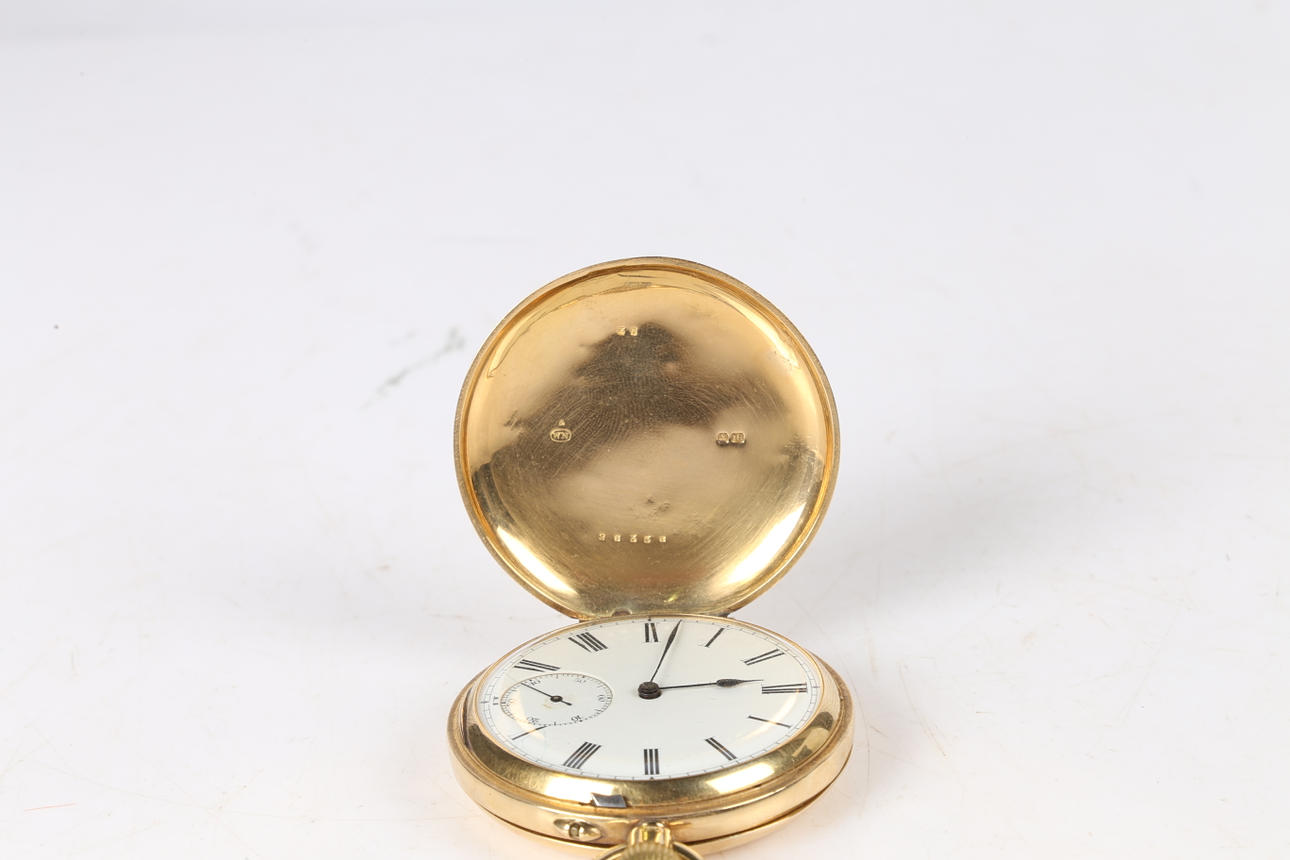 En bra 18 karat guld Full Hunter fickur, fodralet daterat Chester 1895 -fodraltillverkaren William Neal, med en vit emaljerad urtavla med romerska siffror och en subderisk sekunders urtavla placerad vid 6-klockan, urverket numrerat 26358, bruttovikt 118,75 gram.