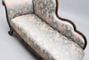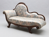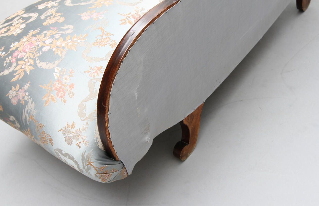 Mahogny med ljusblå klädsel. Längd 170 cm.