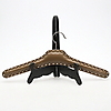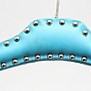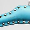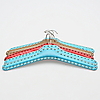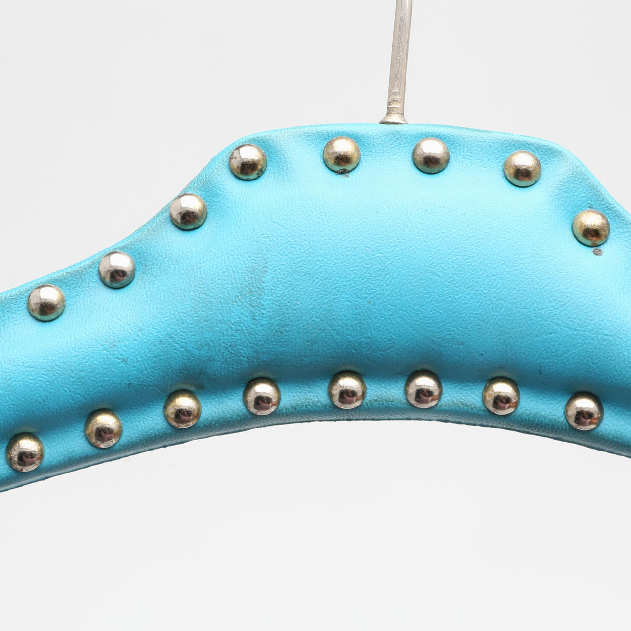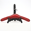 Klädgalgar av trä klädda i läderimitation, fastsatt med nitar. I turkos, röd och brun färg. Den röda snarlika dom andra i formen. Längd ca 42 cm.