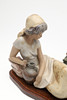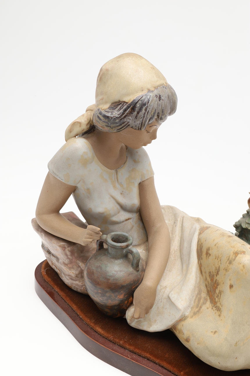 En stor Lladro-sittande figur av en dam med matt glasyr, som håller en vattenurna och på en träsockel. Märkt till basen, Lladro, Handgjord i Spanien, och imponerade märken. 25 cm hög, ca 41 cm lång.