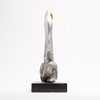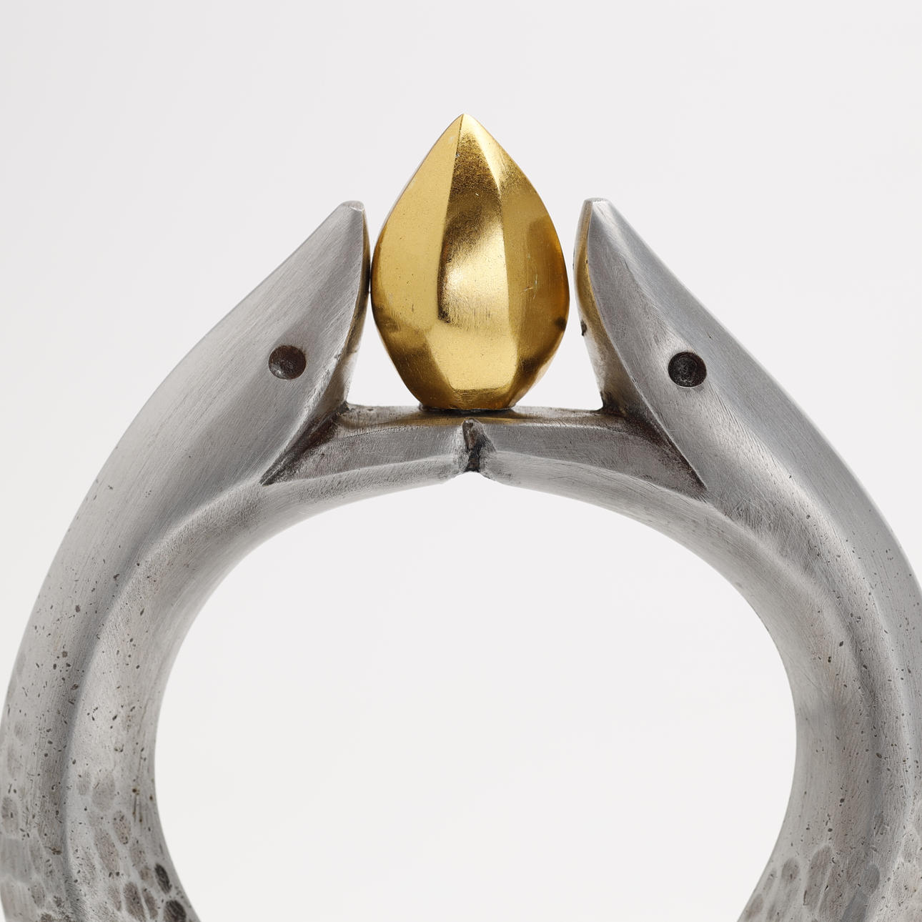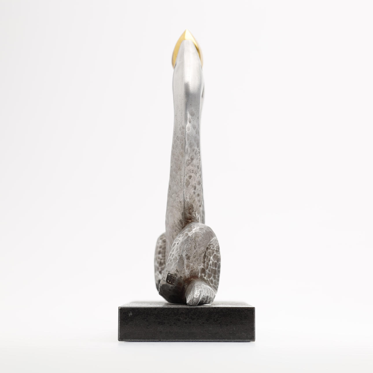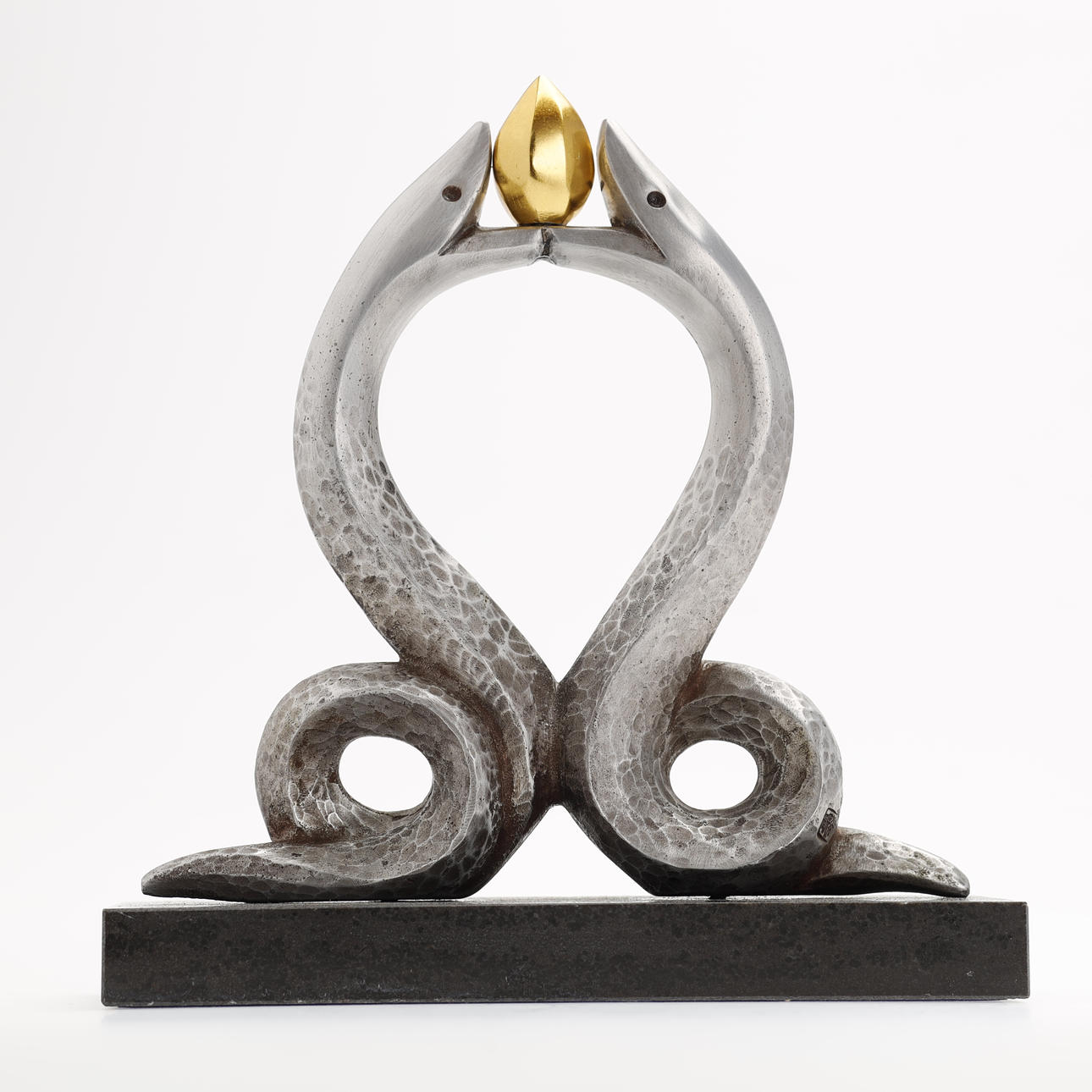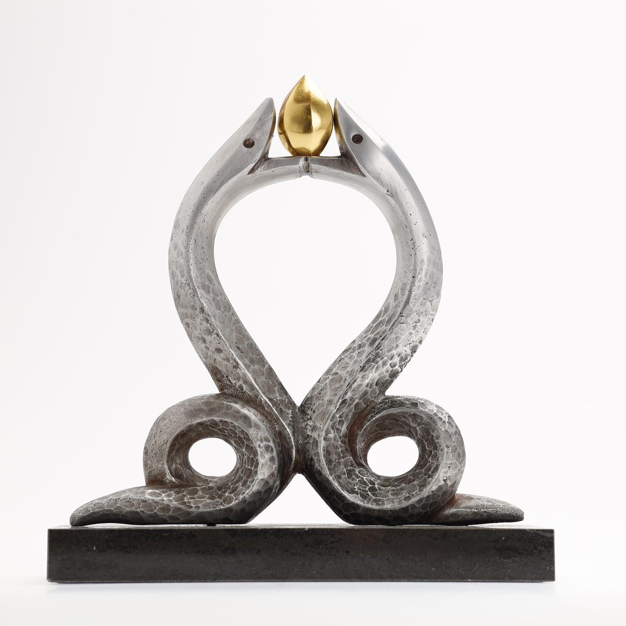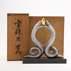 Bronsskulptur av ett par silverfärgade ormar som håller en gyllene klot. Monterad på bas av mörka stenarter. Konstnär: Kobayashi Shomin. Märkt med konstnärens sigill. Levereras med den ursprungliga trälådan signerad och stämplad av konstnären.