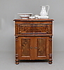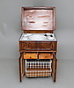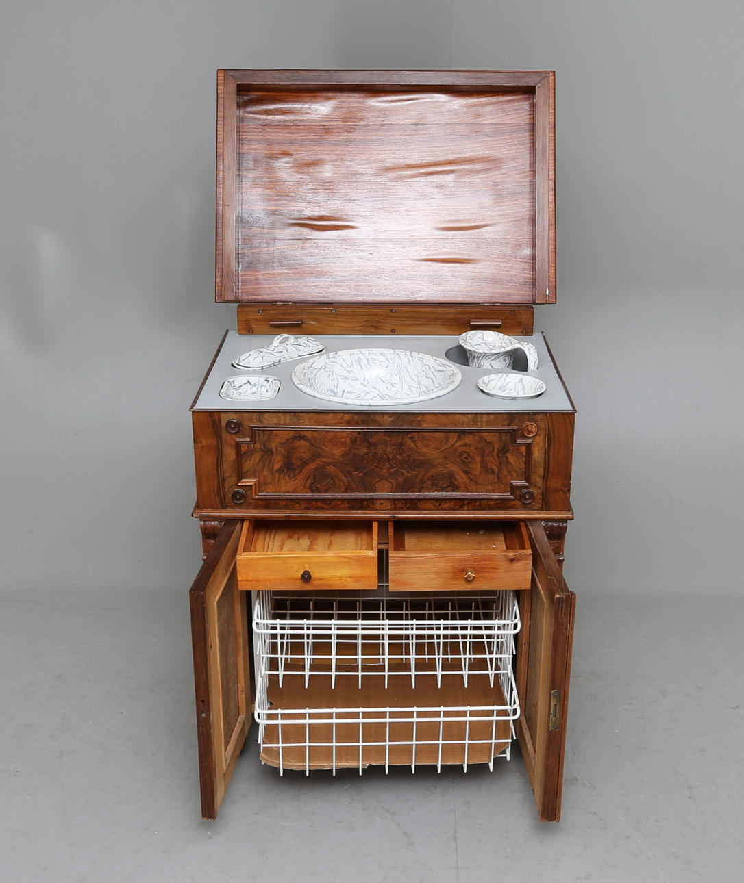 Lavoar med valnötsfaner, lock samt invändig metallhylla. Baksida etikettmärkt: Ilgods från Gefle, Marma. Medföljer senare näthylla i metall.