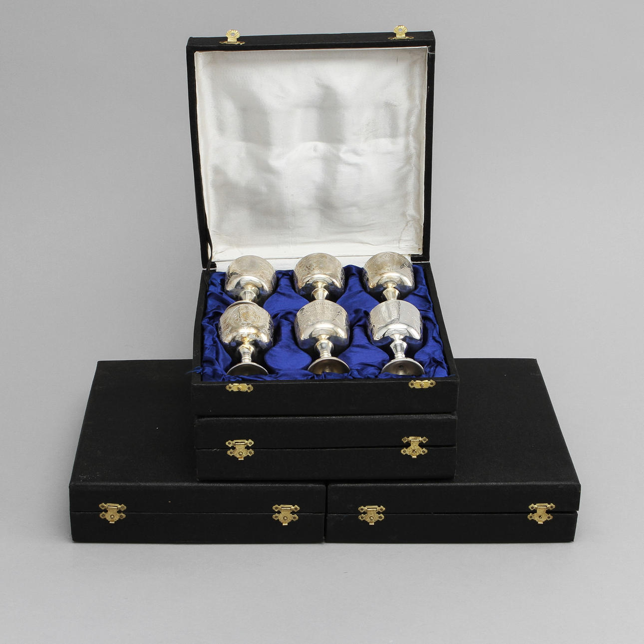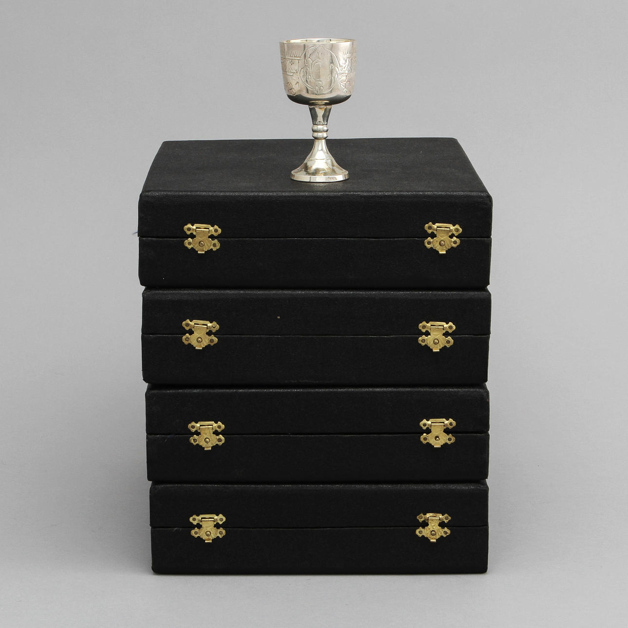 Graverad geometrisk samt floral dekor. Höjd 8 cm. 4 st schatull tillkommer.