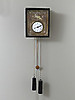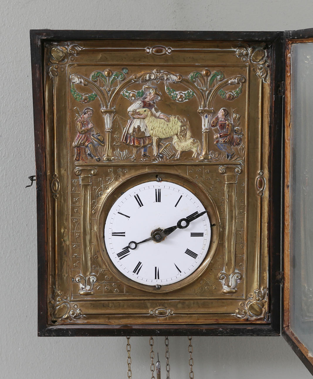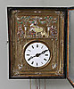 Med urtavla i emaljerad plåt, omgärdad av mässingsplåt i reliefdekor med profant motiv.