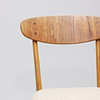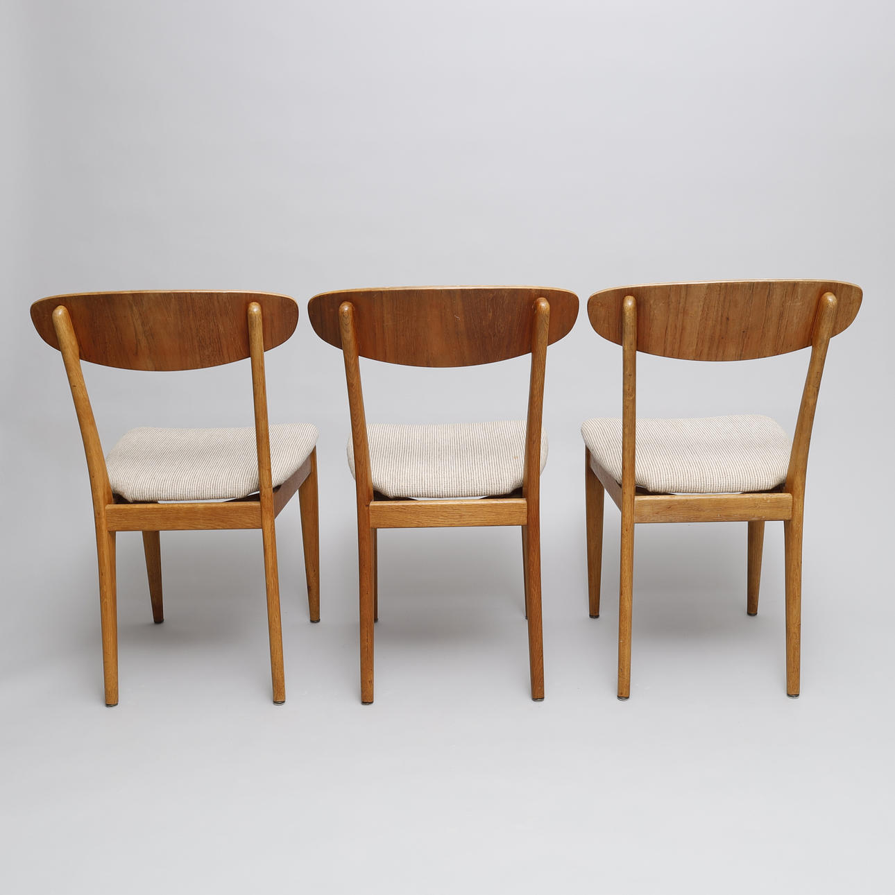 Matbordsstolar modell 162 (5 st), Slagelse Møbelverk. Ekram, koppstycke laminerat trä med teakfaner. Omslag av randigt beige ulltyg. Danmark.