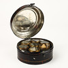 Rund, bemålad form med lock och inskription, Bemürt samt hasp.