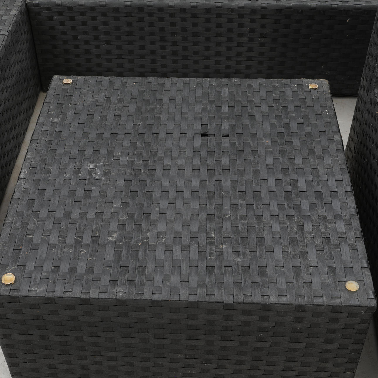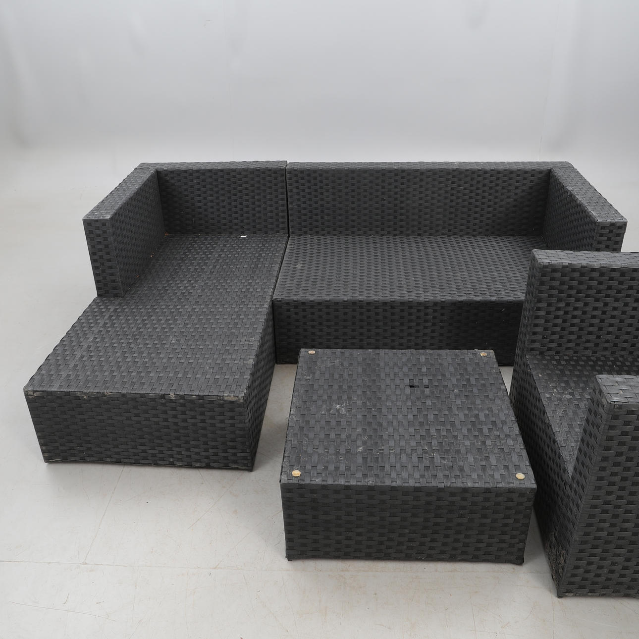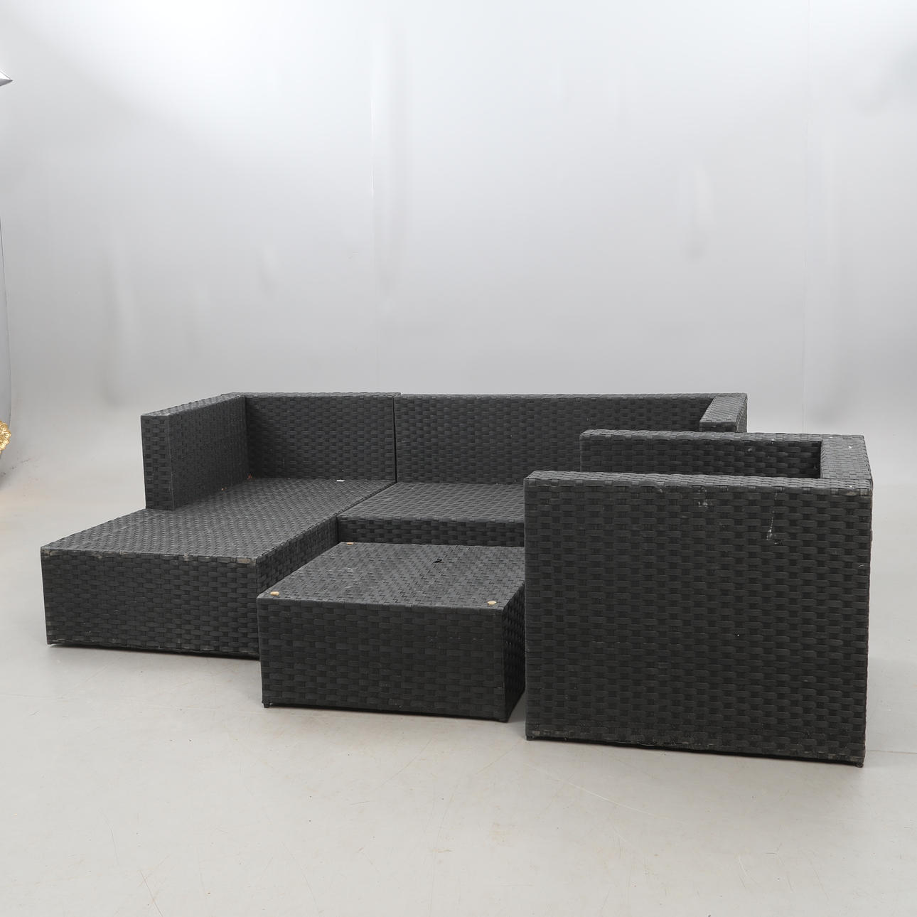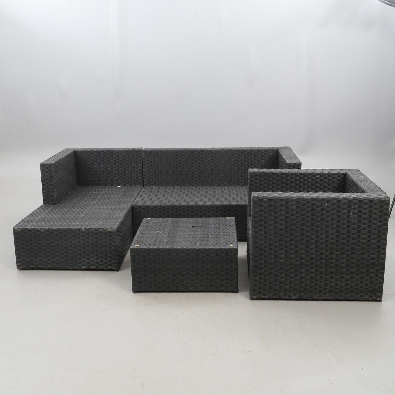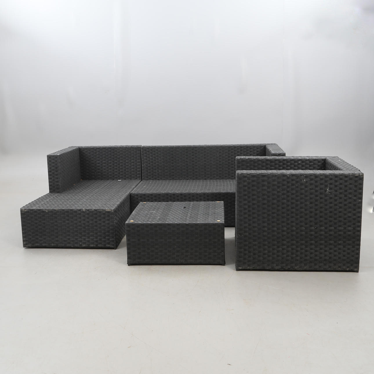3230228. TRÄDGÅRDSSOFFGRUPP, konstrotting, samt DYNLÅDA. 5 delar.