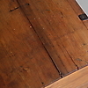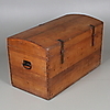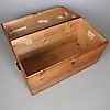 Åldersslitage, slagmärken, spricka längs med lock, vita färgfläckar på insida lock, lås saknas.