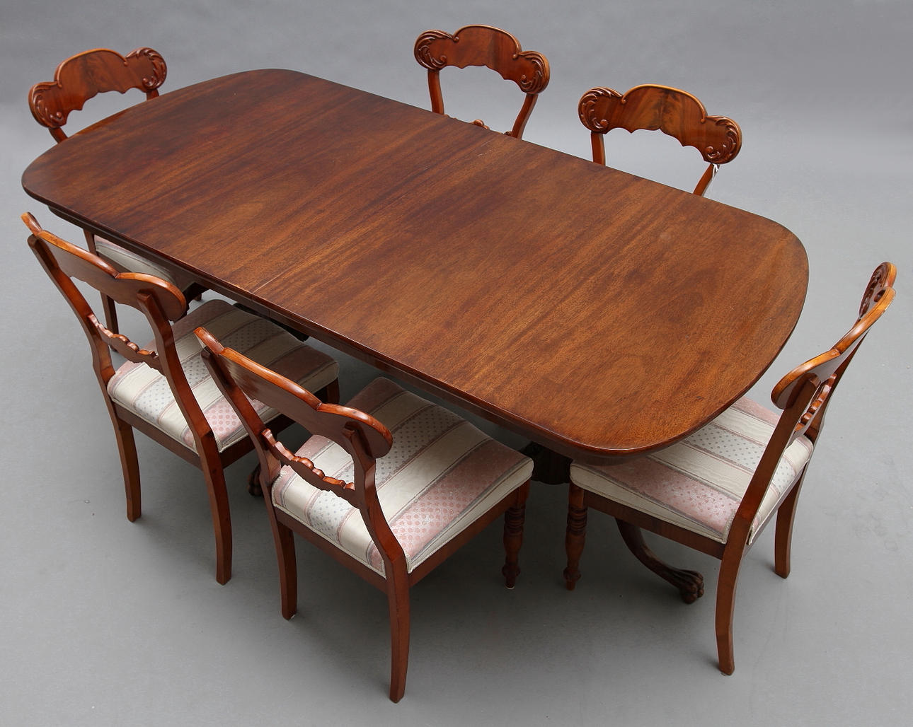 Bord med iläggsskiva samt 6 stolar. Bordets längd 180, bredd 90, höjd 88 cm, iläggsskiva á 40 cm.