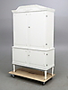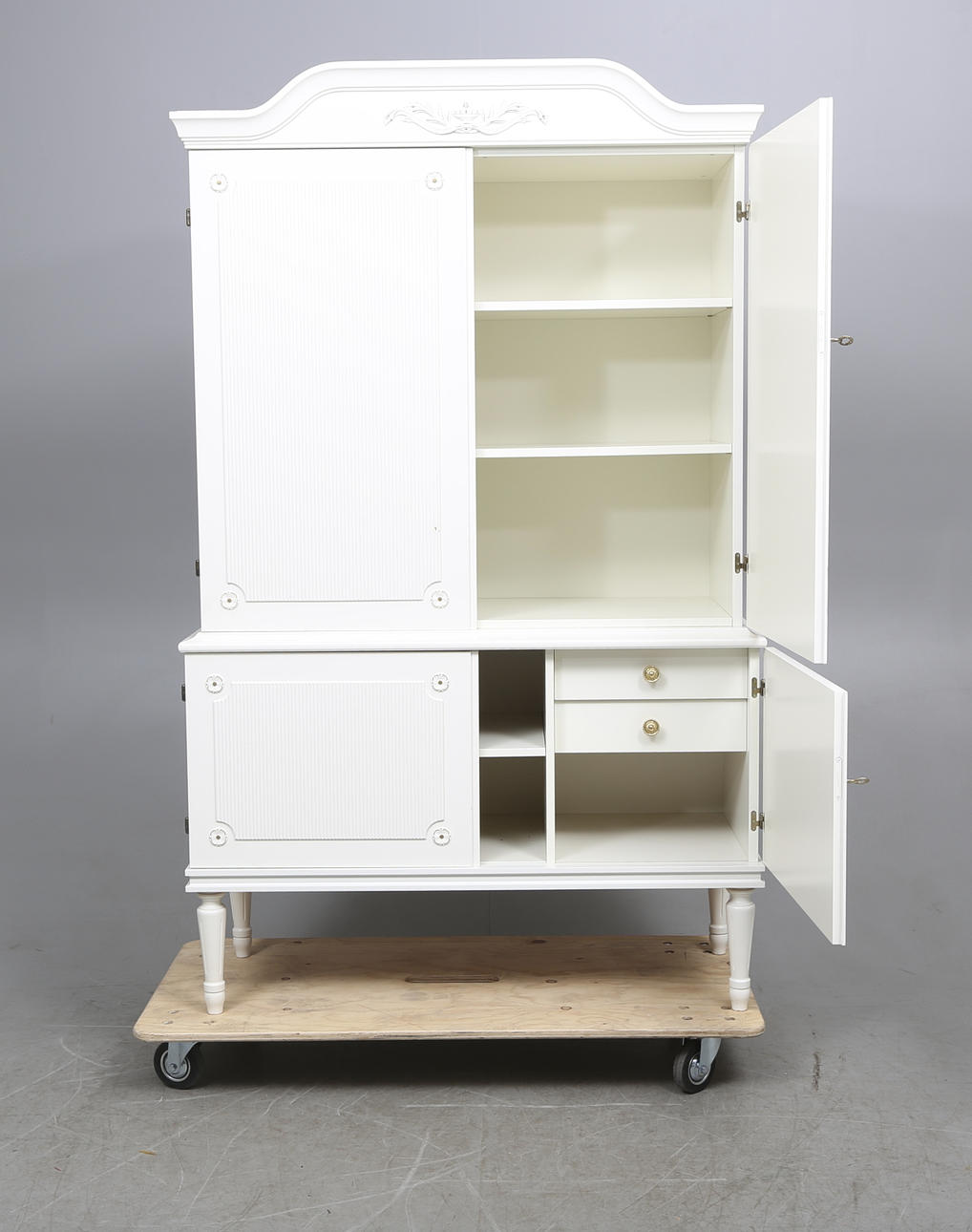Vitmålat med förgylld dekor. Dekor med fleuroner, pokal och räfflor. Inrede med hyllor och 2 lådor. 2 nycklar. Tvådelat.