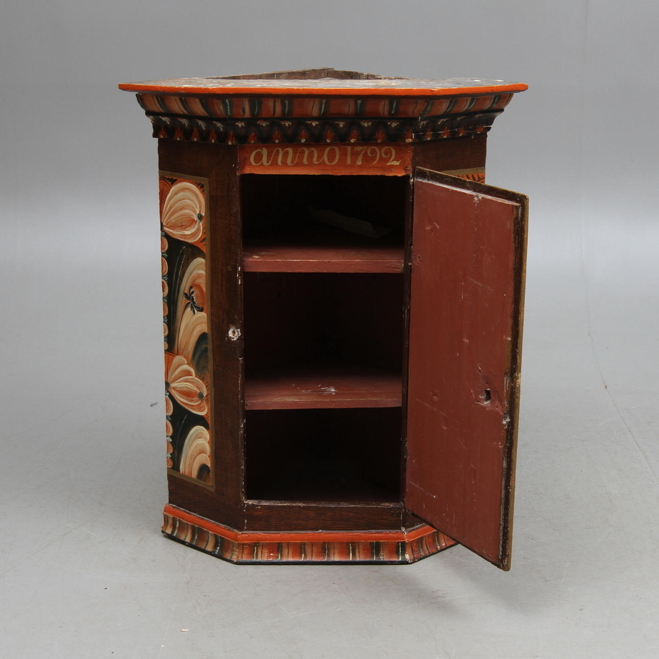 Slitage, smärre skador, lås saknas, renoverat, senare bemålning.