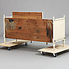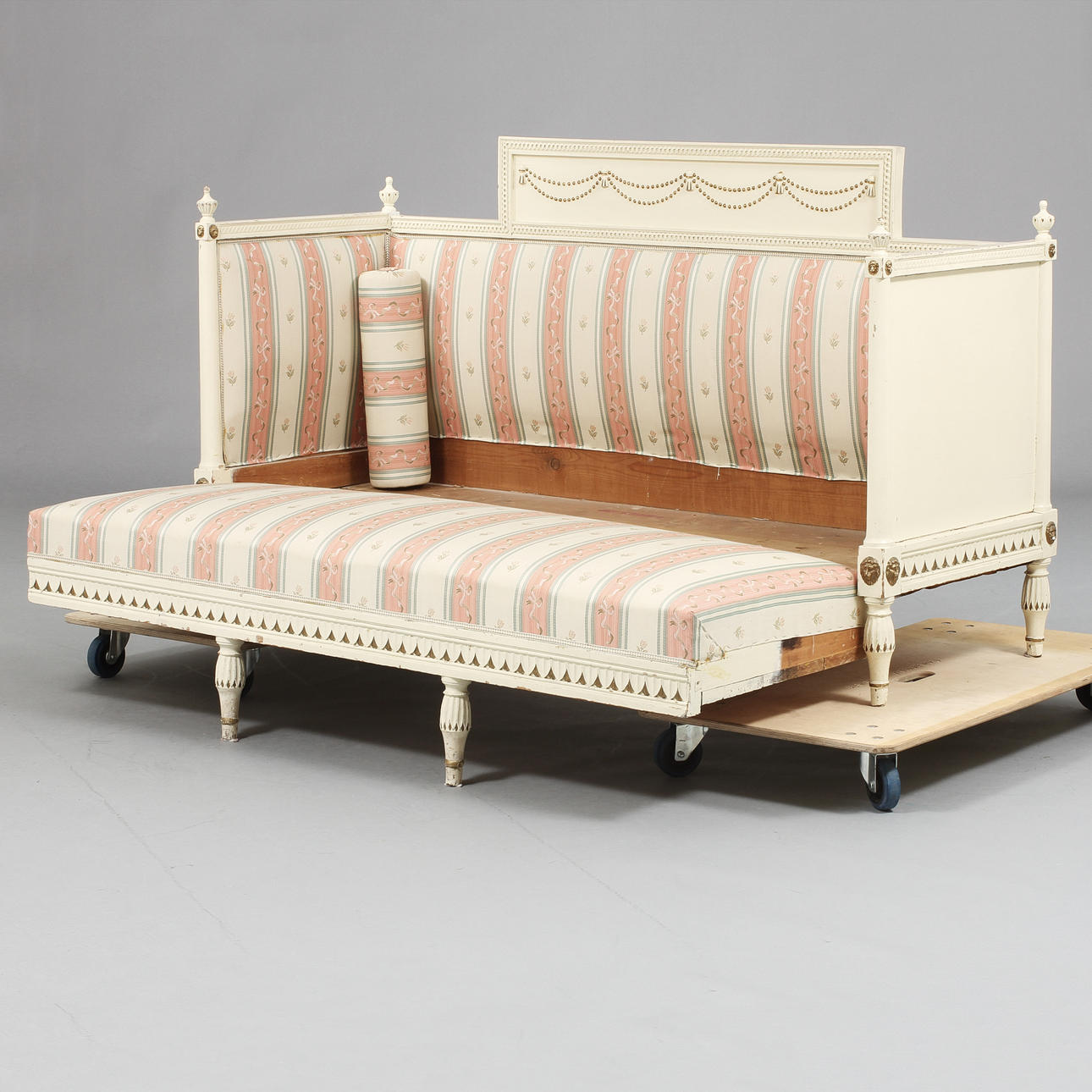 Längd 188, bredd 59, höjd 108 cm. Utdragbar. Vitmålad soffa med randig ljus textil.
