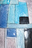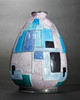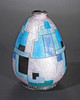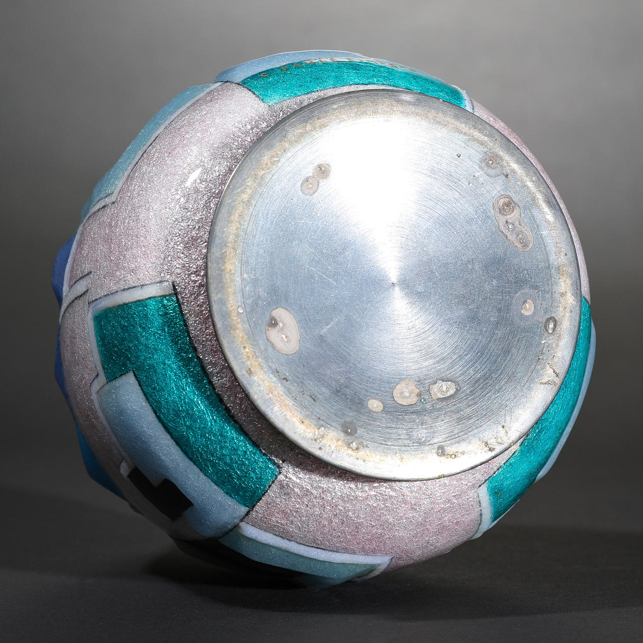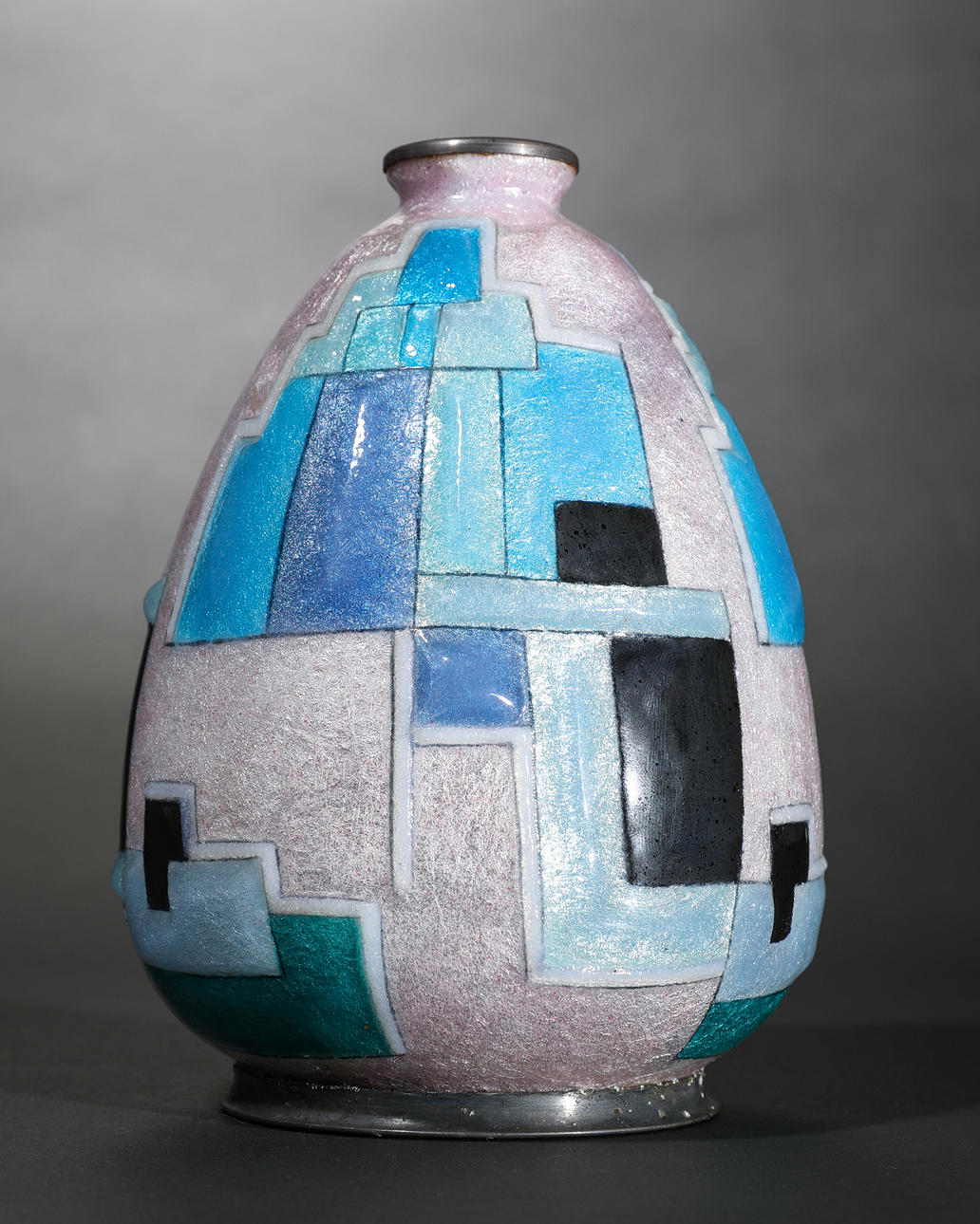vas. Omkring 1925. koppar, emalj. Dekorativ geometrisk reliefvägg med plastemaljdekoration i nyanser av blå/turkos, ljus rosé, vit och svart på en bakgrund täckt med silverfolie. Tårform med en liten, lätt utsvängd mun. H. 15,5 cm. Inskrivet längst ner: C. Fauré Limoges (guld).