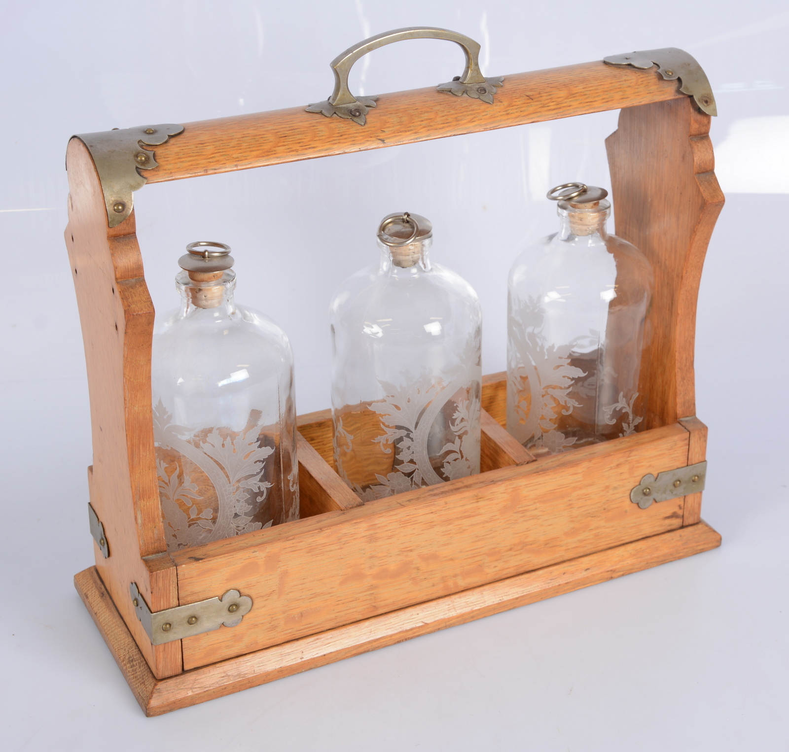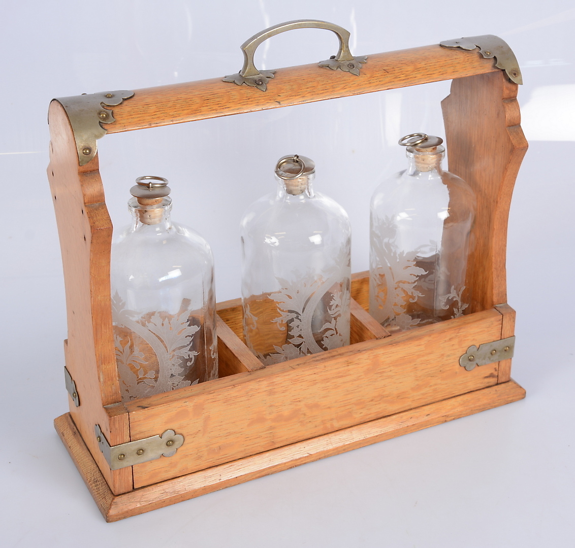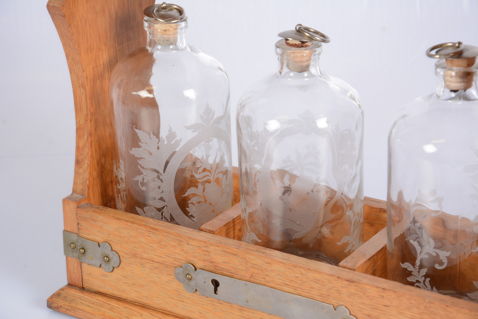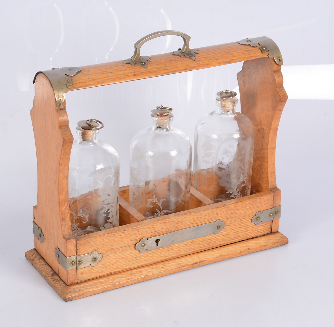 323978. RESESCHATULL med 3 flaskor, trä, glas, 1900-talets slut.