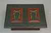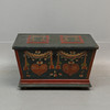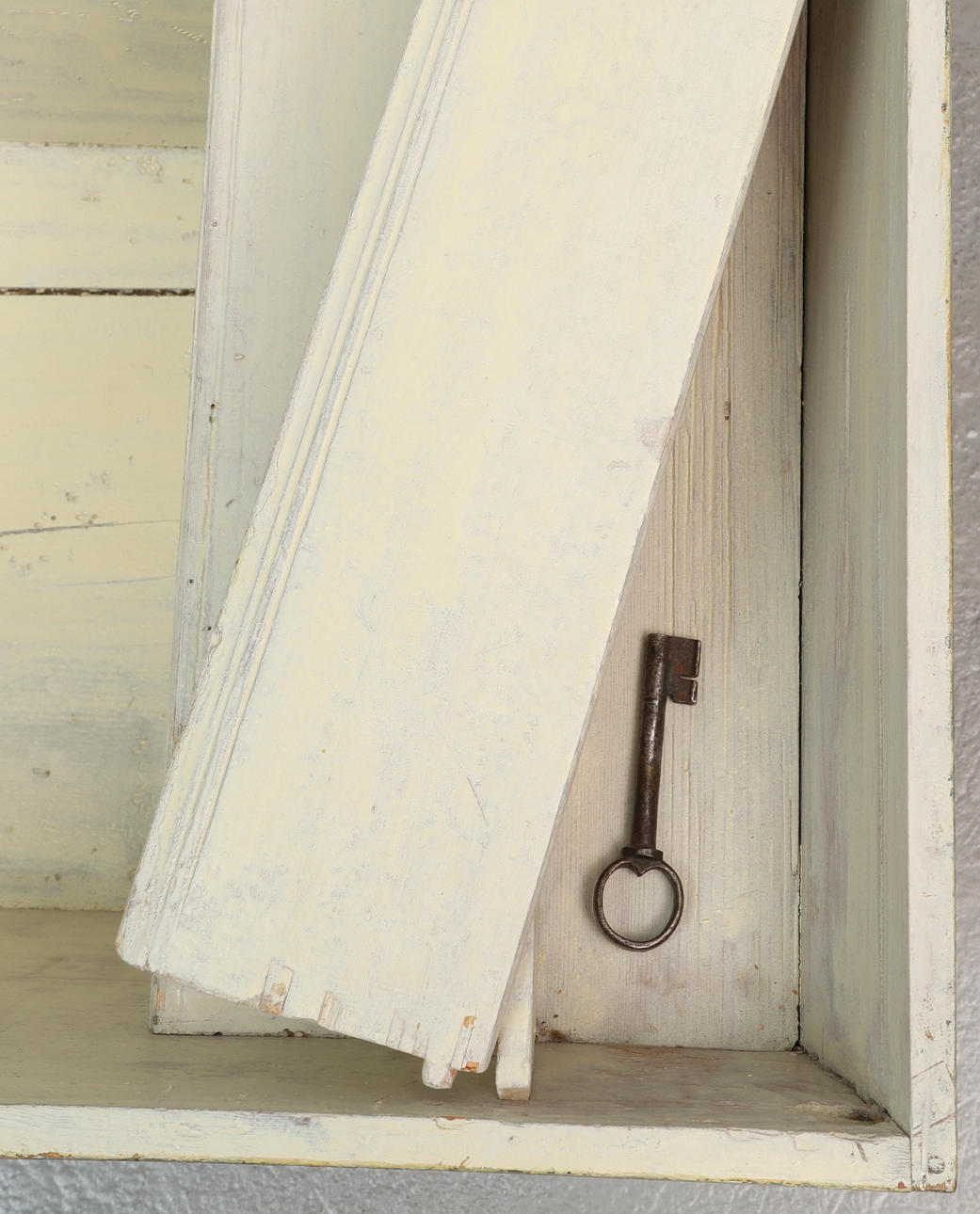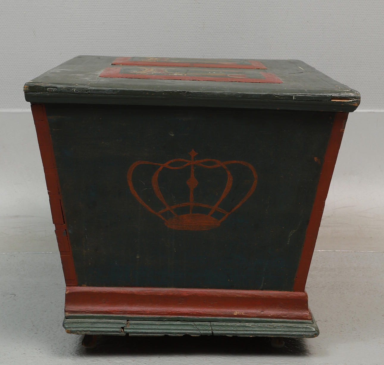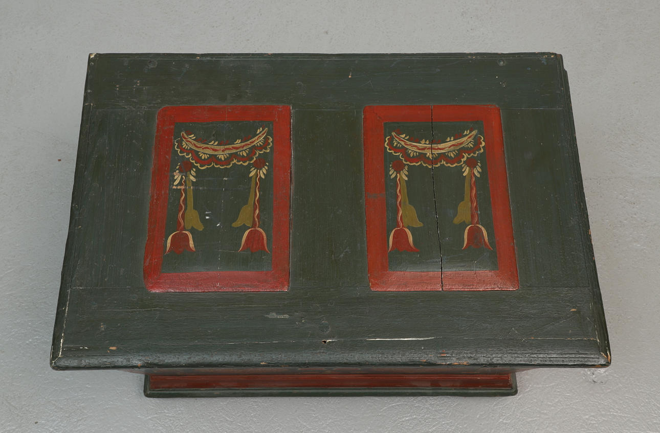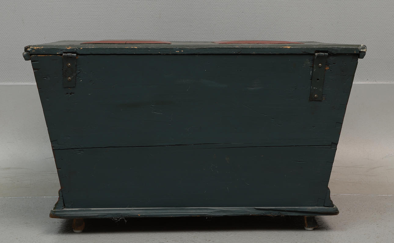 Genomgående sprickor, skav/märken i trä & färg, defekt lås, ytsmuts.