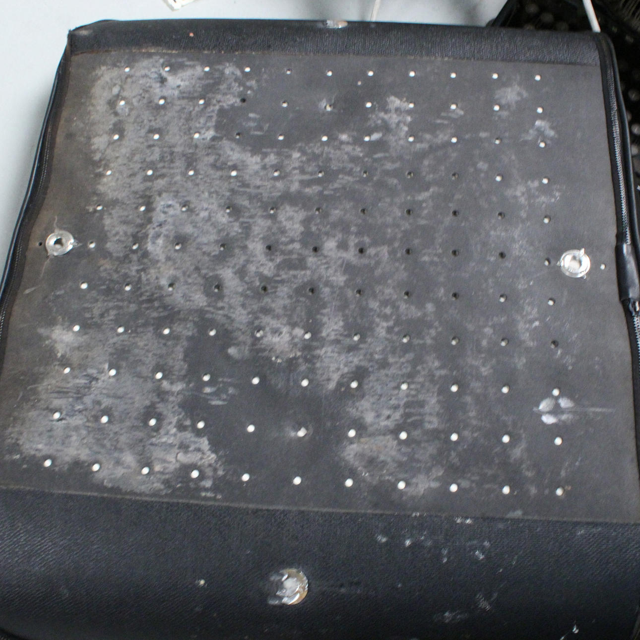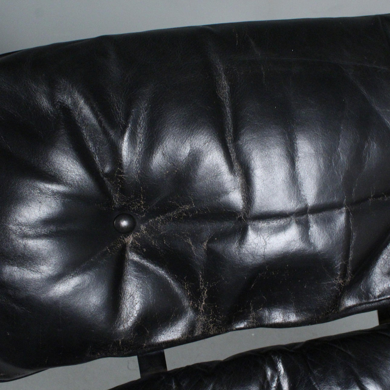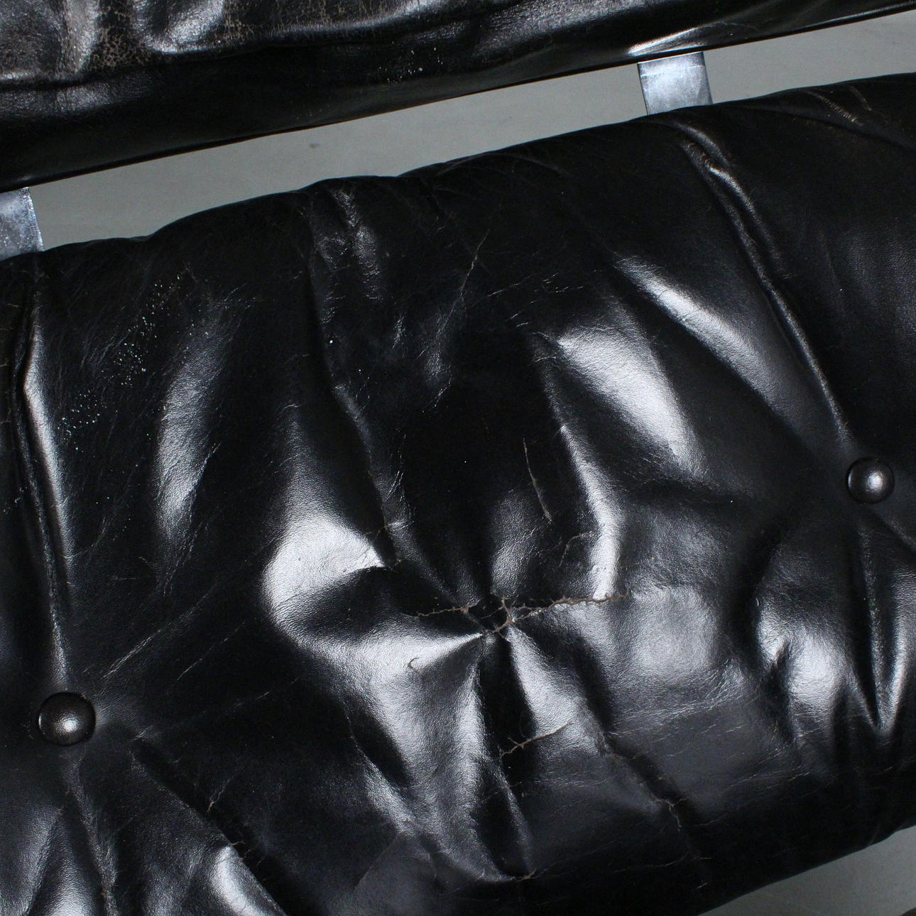 Åldersanpassat tillstånd med allvarliga tecken på slitage, limrester, knappar saknas, skört läder, sprickor på sätets skal.