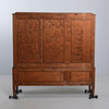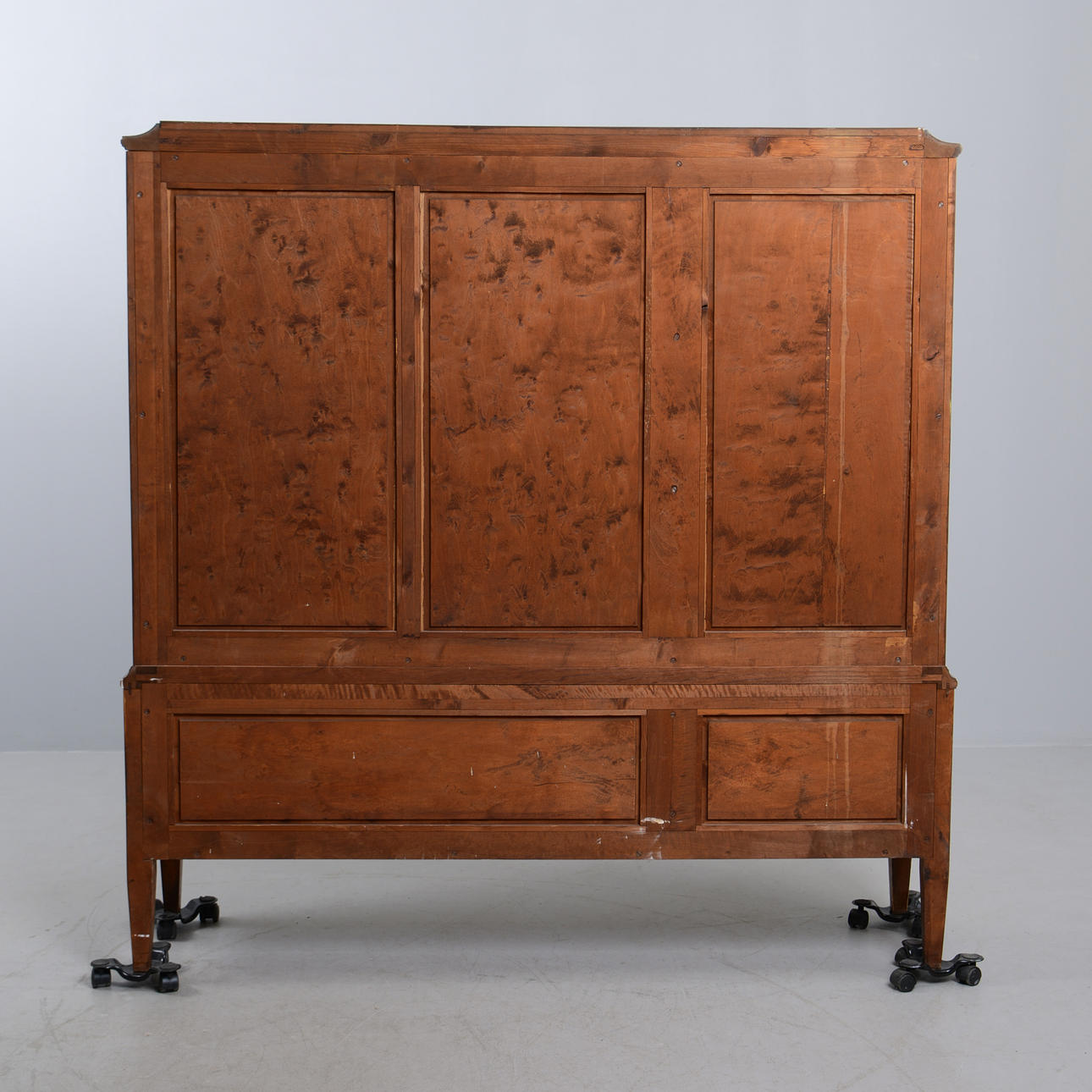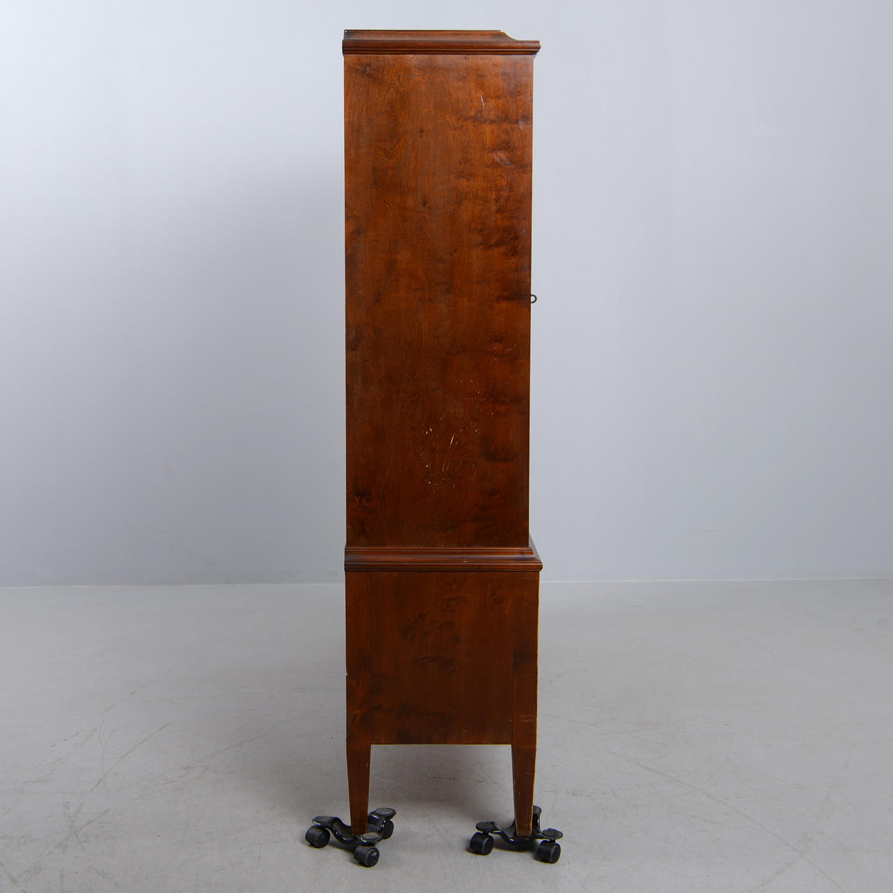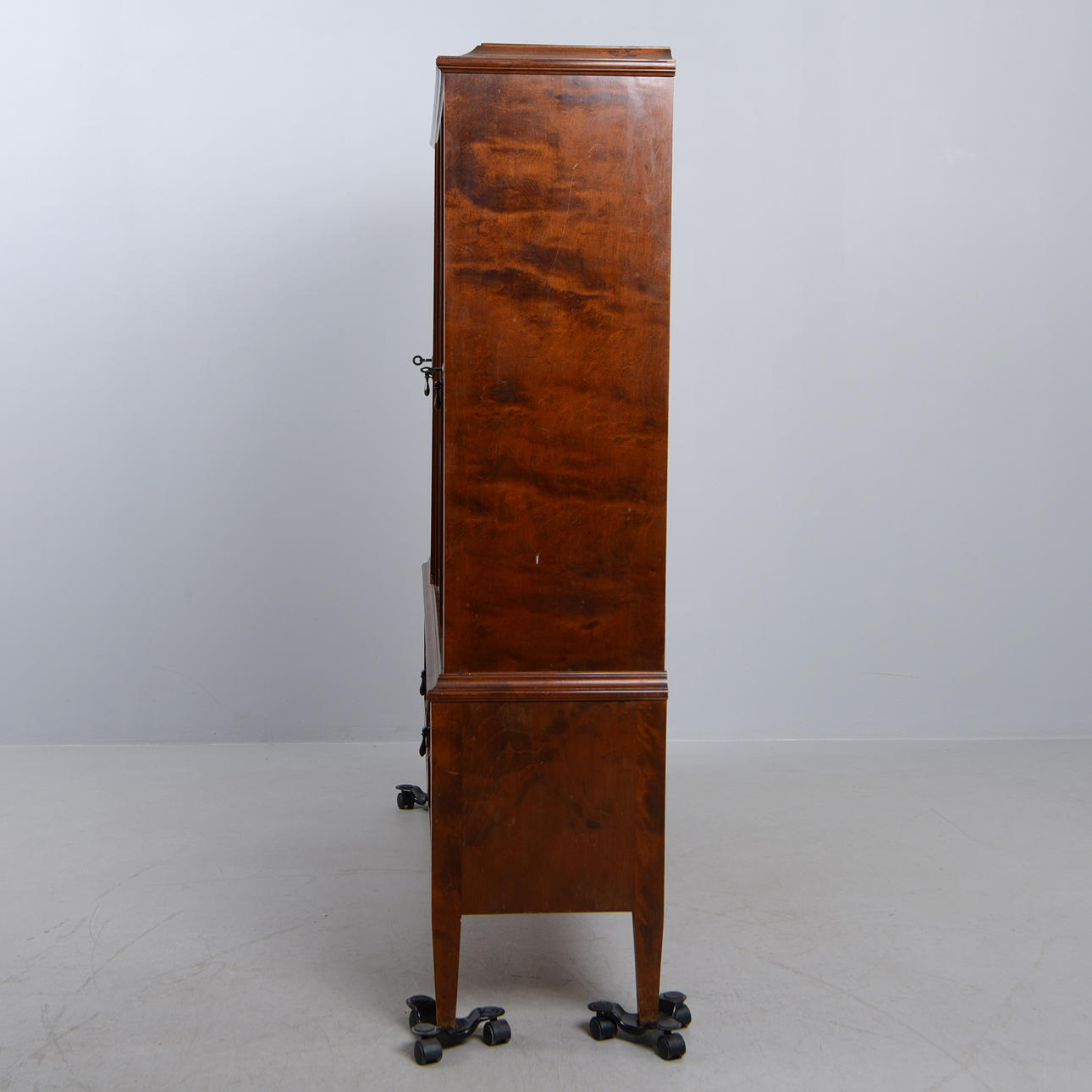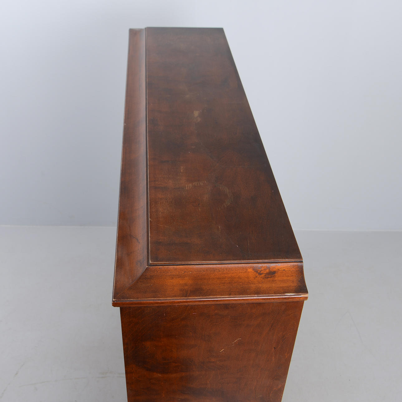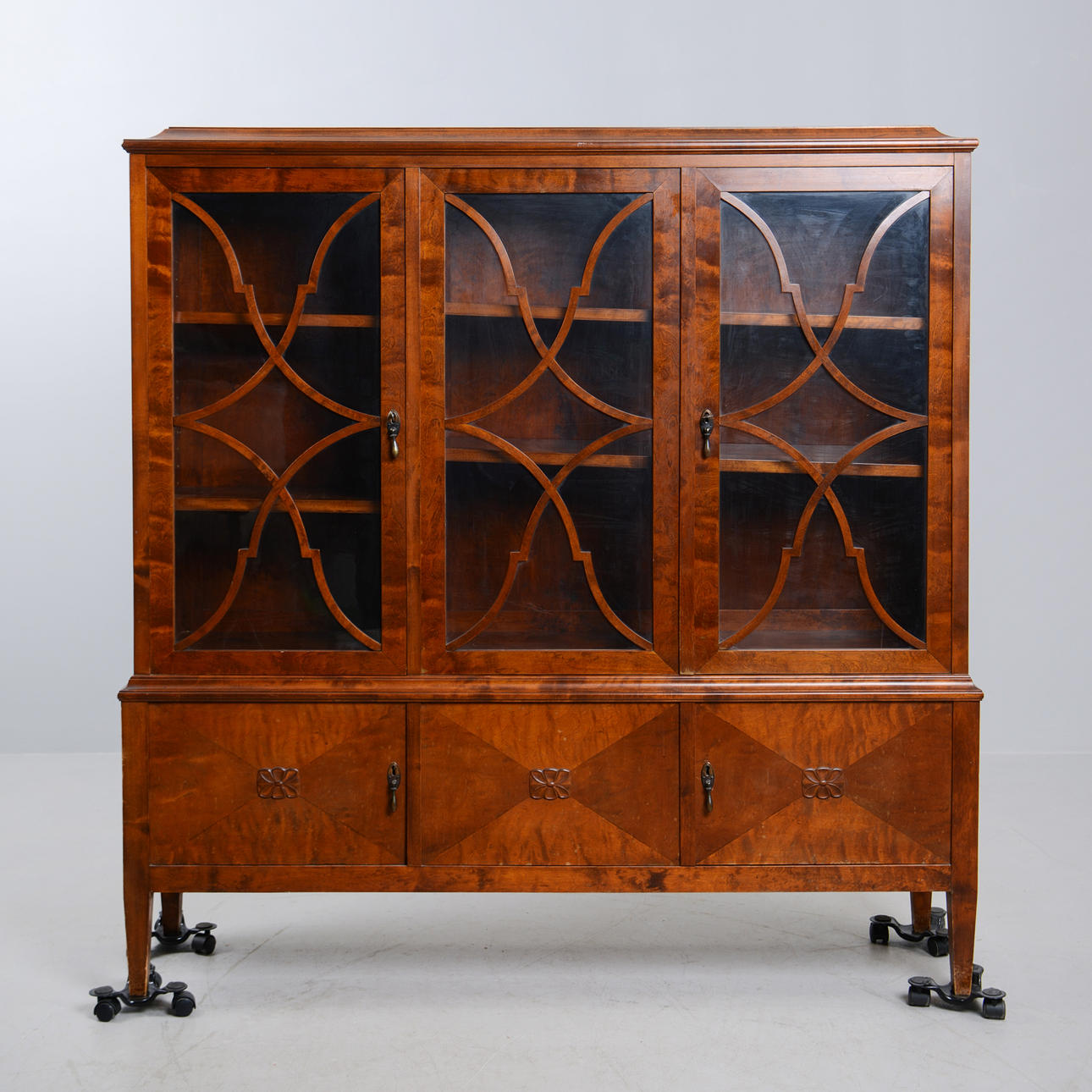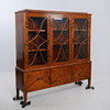 Björk. Front med spröjsade vitrindörrar och bakomliggande hyllplan. Tre lådor undertill. Längd 140 cm. Djup 35 cm. Höjd 145 cm.