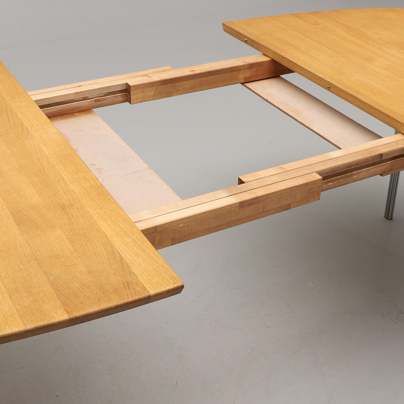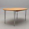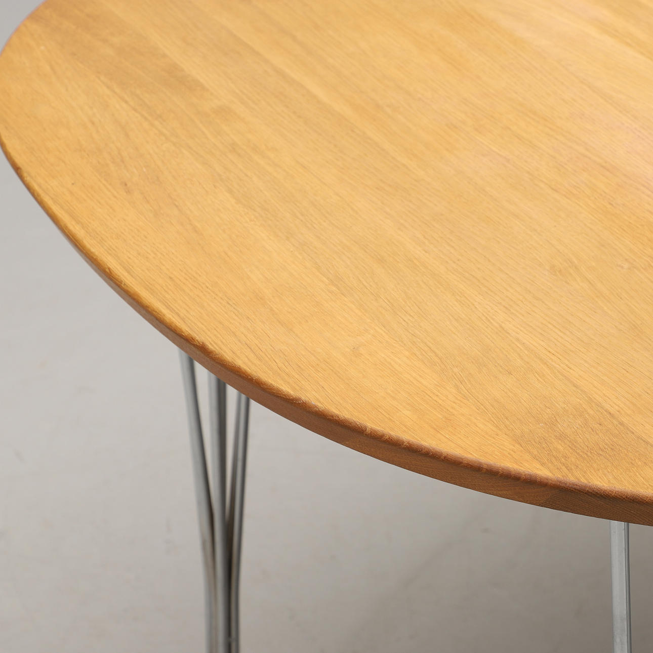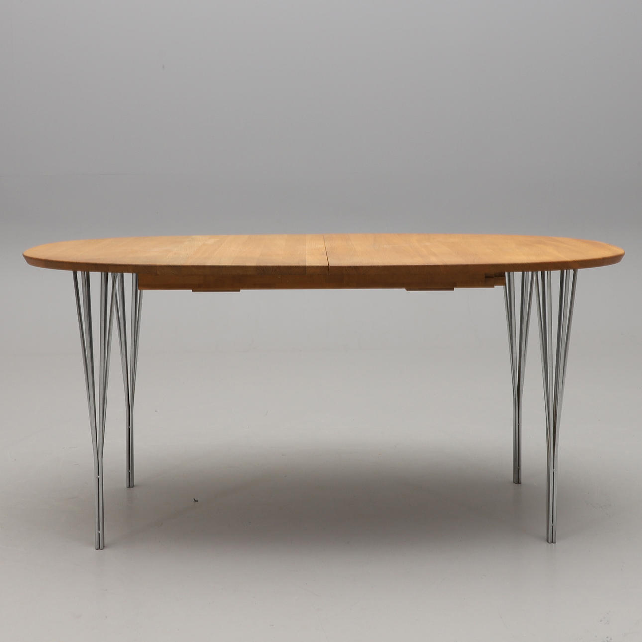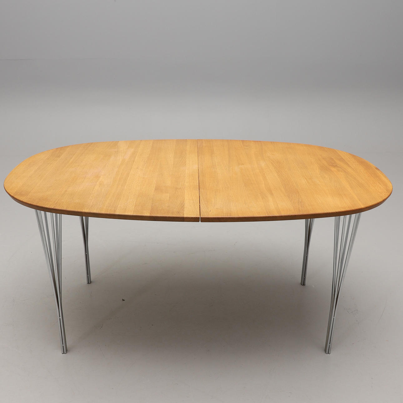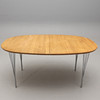 Etikett- och brickmärkt. Skiva i ek, spända ben i förkromat stål. Längd 160, bredd 105, höjd 74 cm.