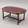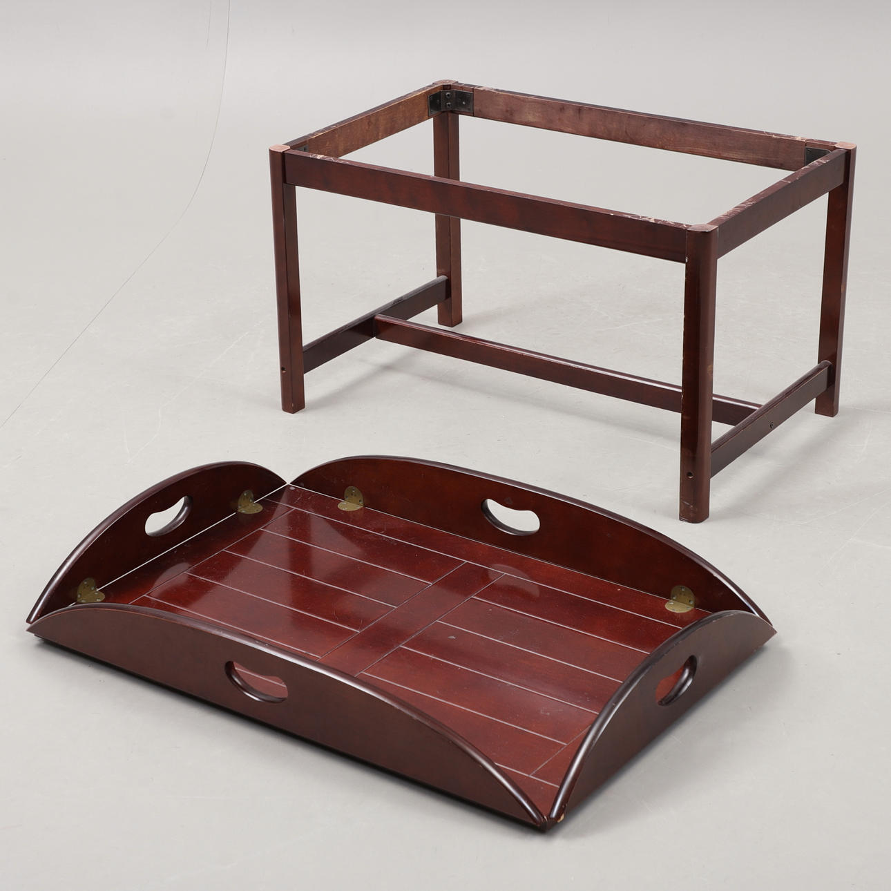 Höjd 50 cm, mått med uppfällda klaffar 90x60 cm, mått med nedfällda klaffar 109x79,5 cm. Så kallad "Butlers Tray". Avtagbar bricka.
