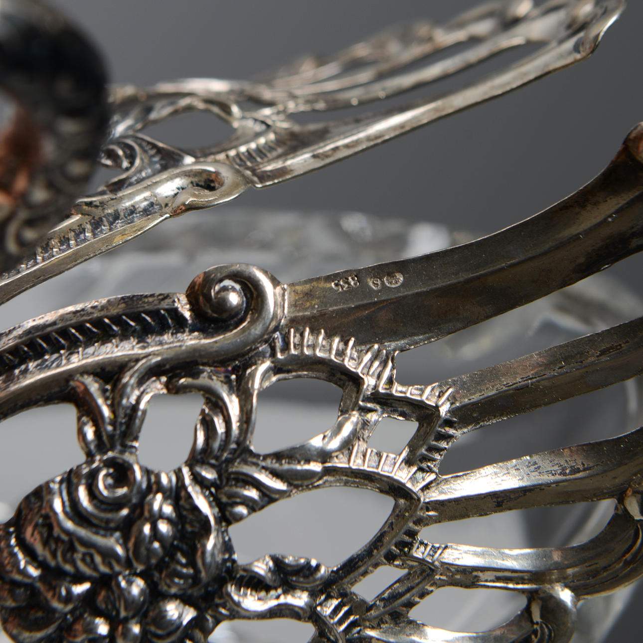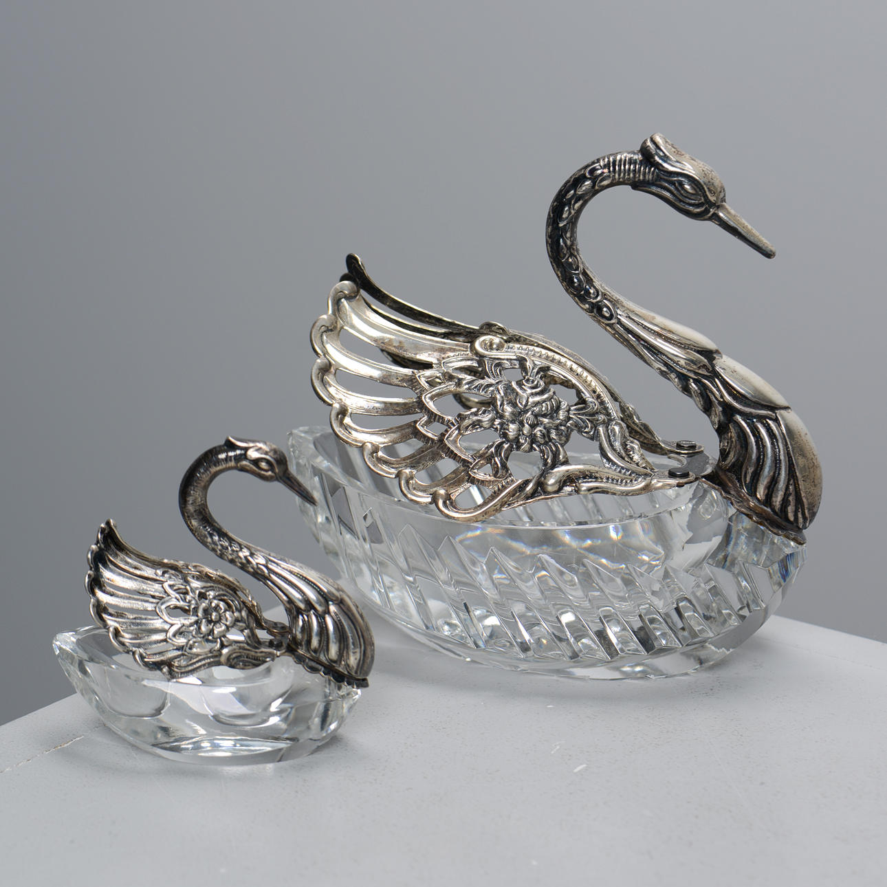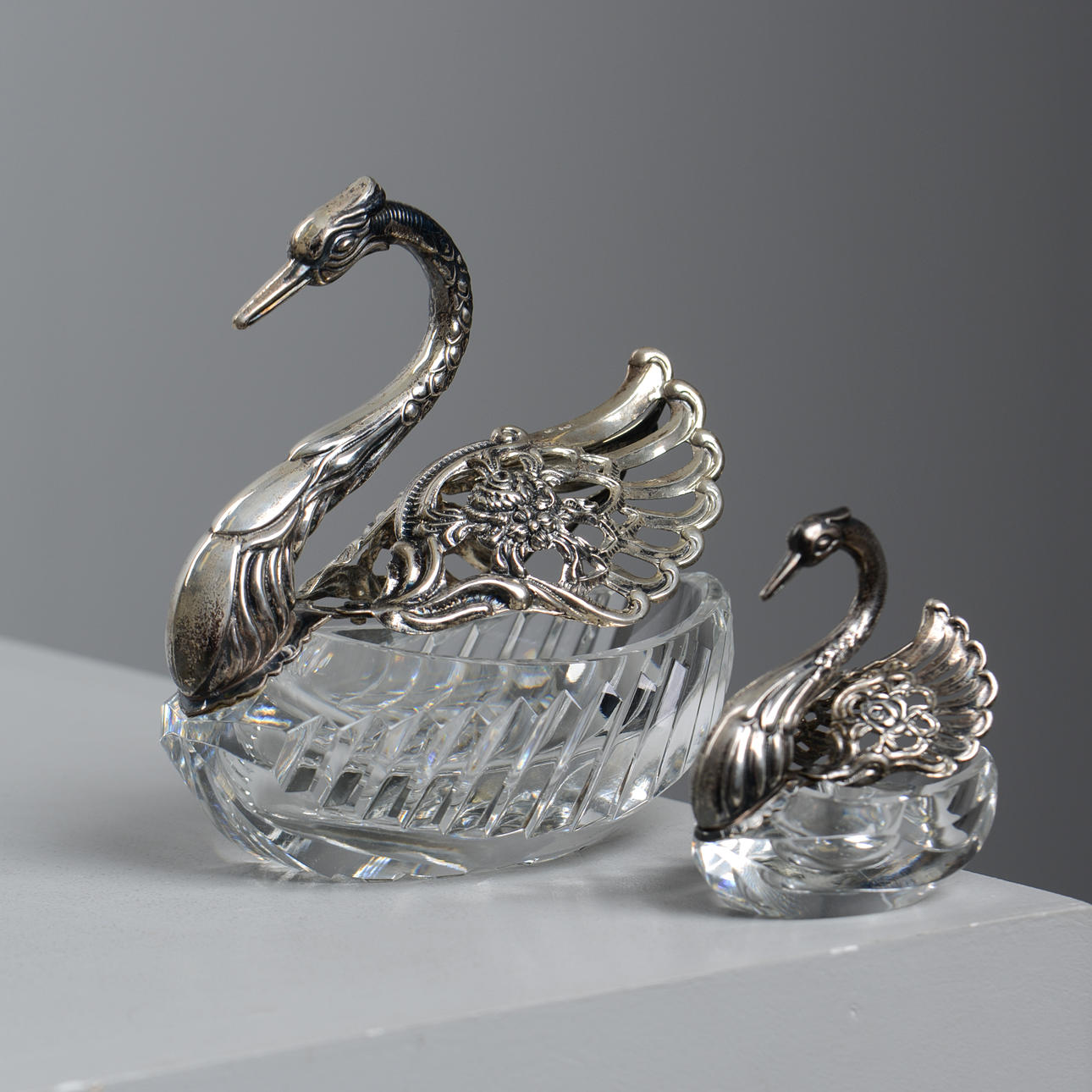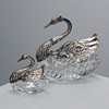 Föreställande svanar, med huvud, hals och vingar i silver. Skålbotten i glas varav den större med slipad dekor.
