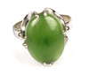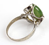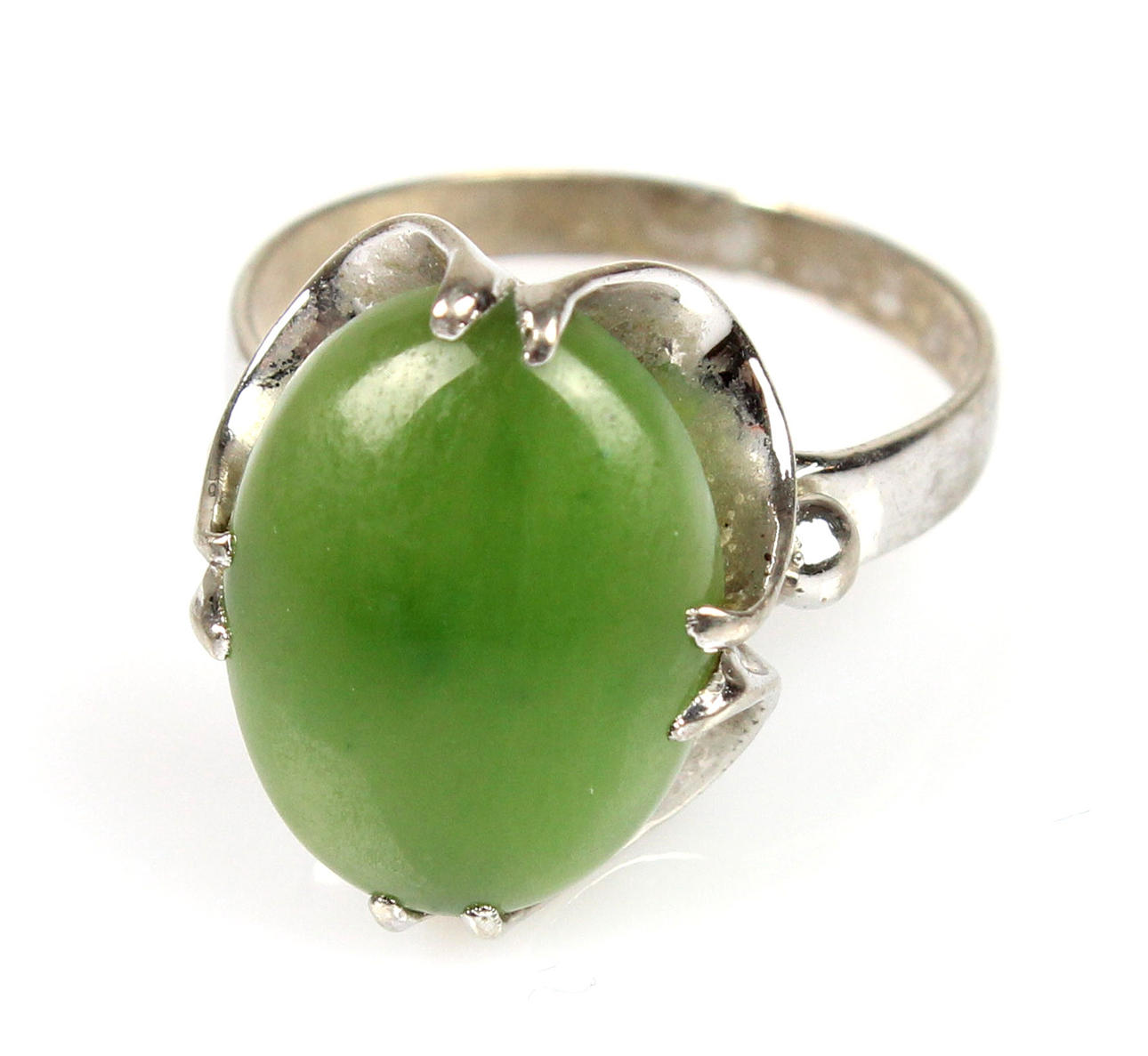 Ringen är stickad och stämplad i 835 silver. Set med oval jade-cabochon i krökt rosett, ringstorlek 57, ringhuvud 17,5 x 14 mm, vikt 4 gram.