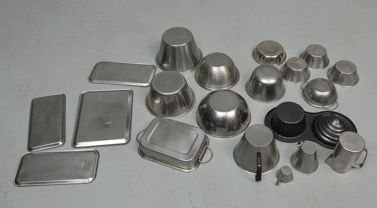 Bunkar/skålar, diameter ca 15-25 cm. Dubbel kakform, bredd ca 39 Brickor, ca 33x16,5 - 33x25,5 cm. Sil. Mått.