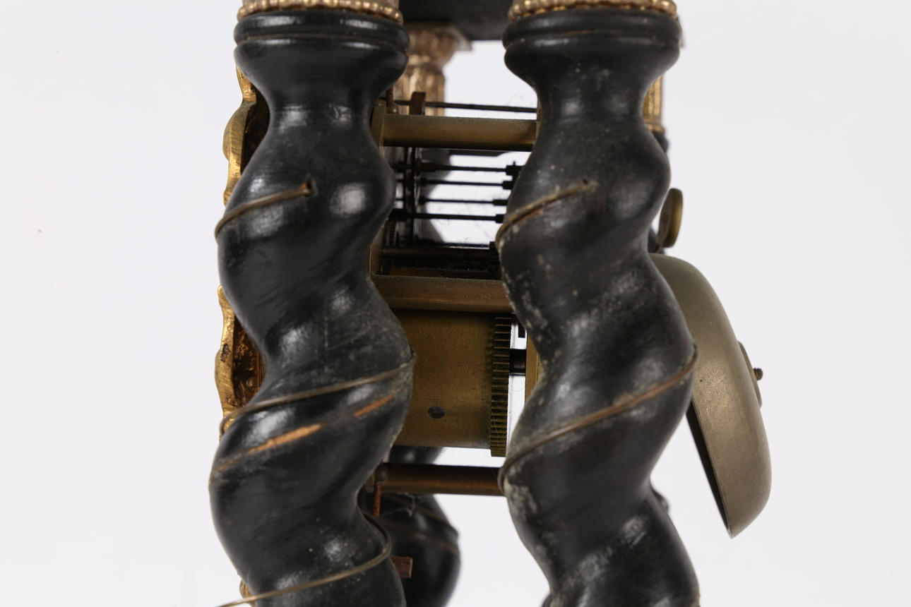 bulten för att hålla klockan i fodralet saknas, ingen nyckel närvarande, den mässinglade tråden till kolumnerna lossnar, förluster för inlägg.