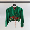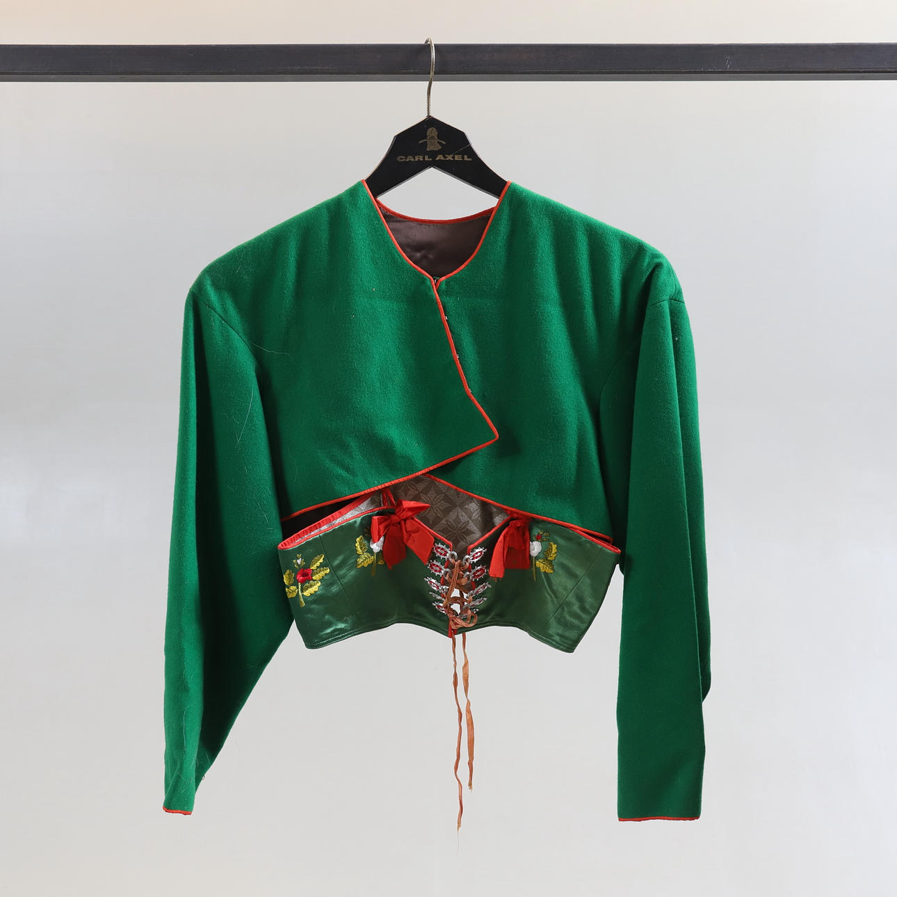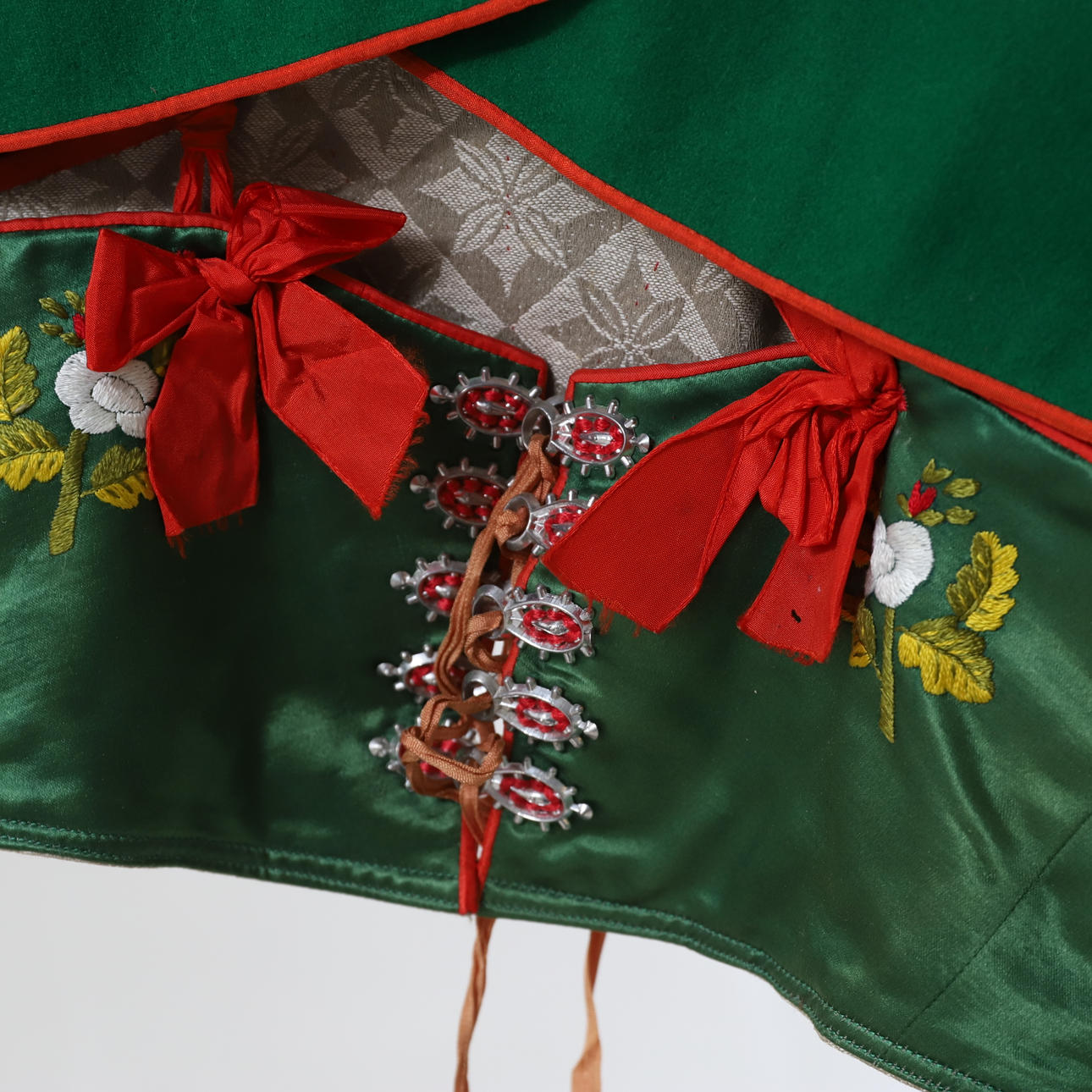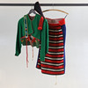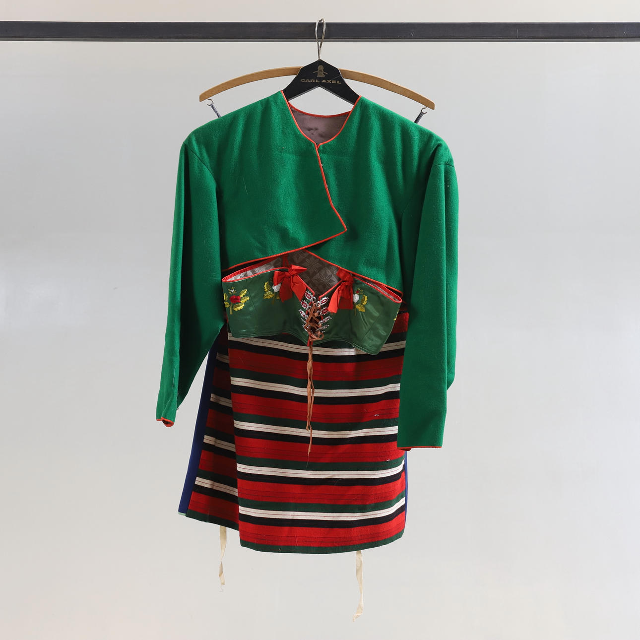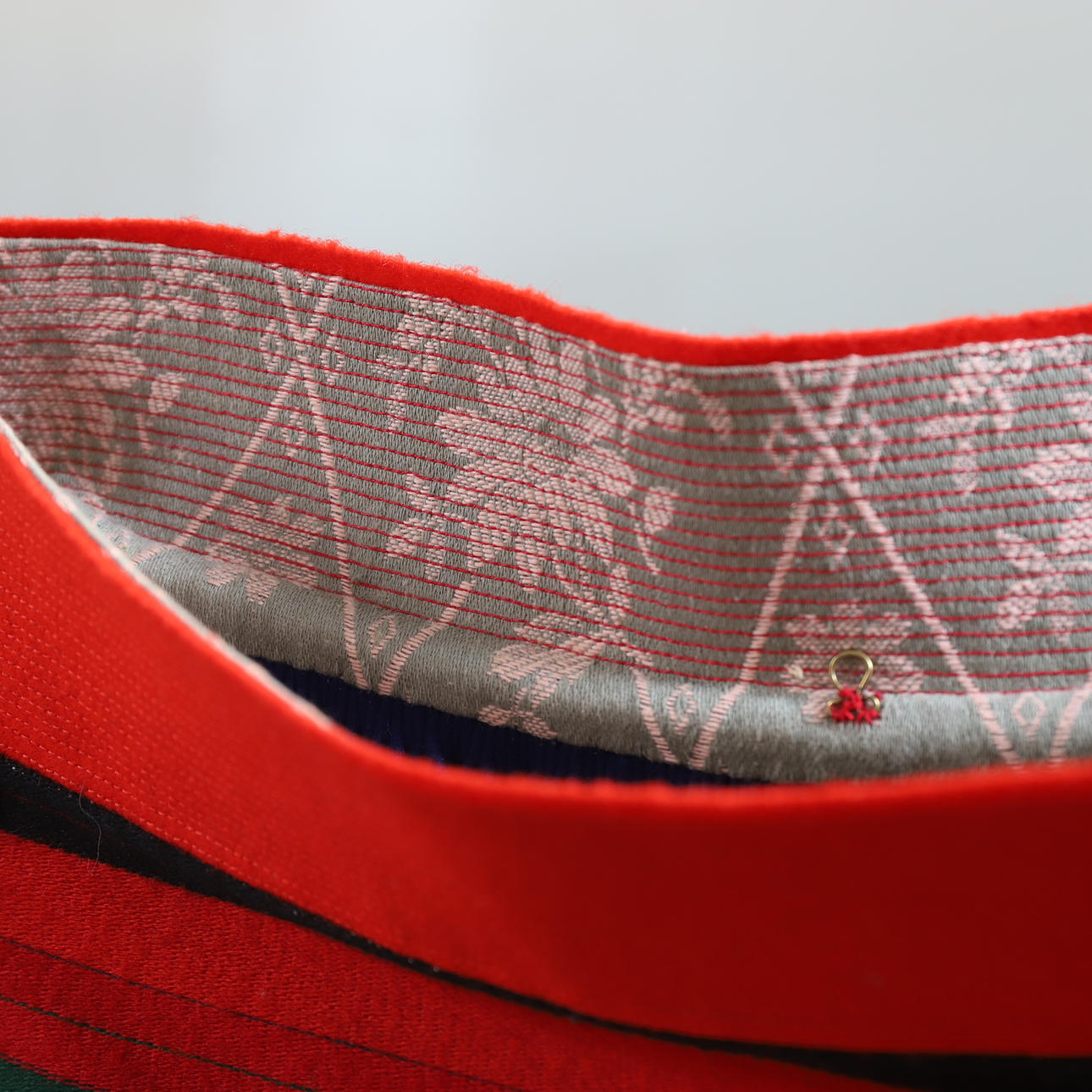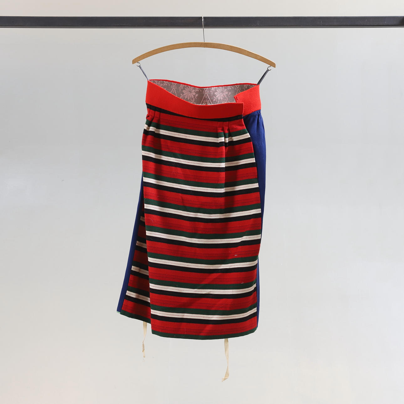 Blå kjol med infälld randig kjolbredda, bredd över midja ca 36 cm.