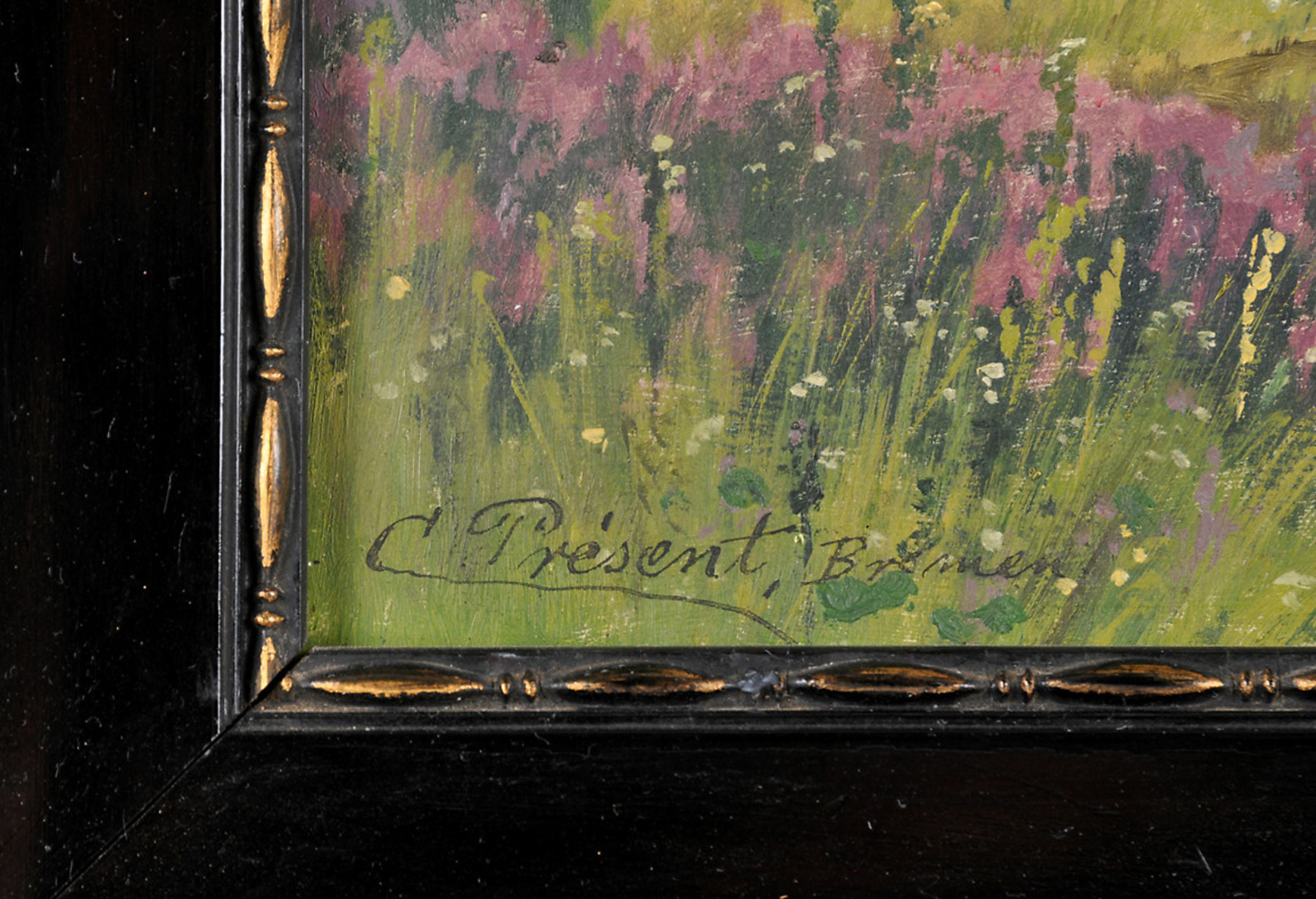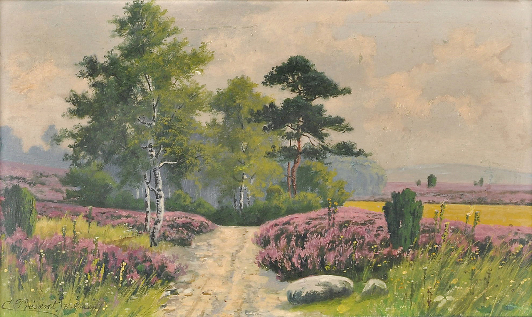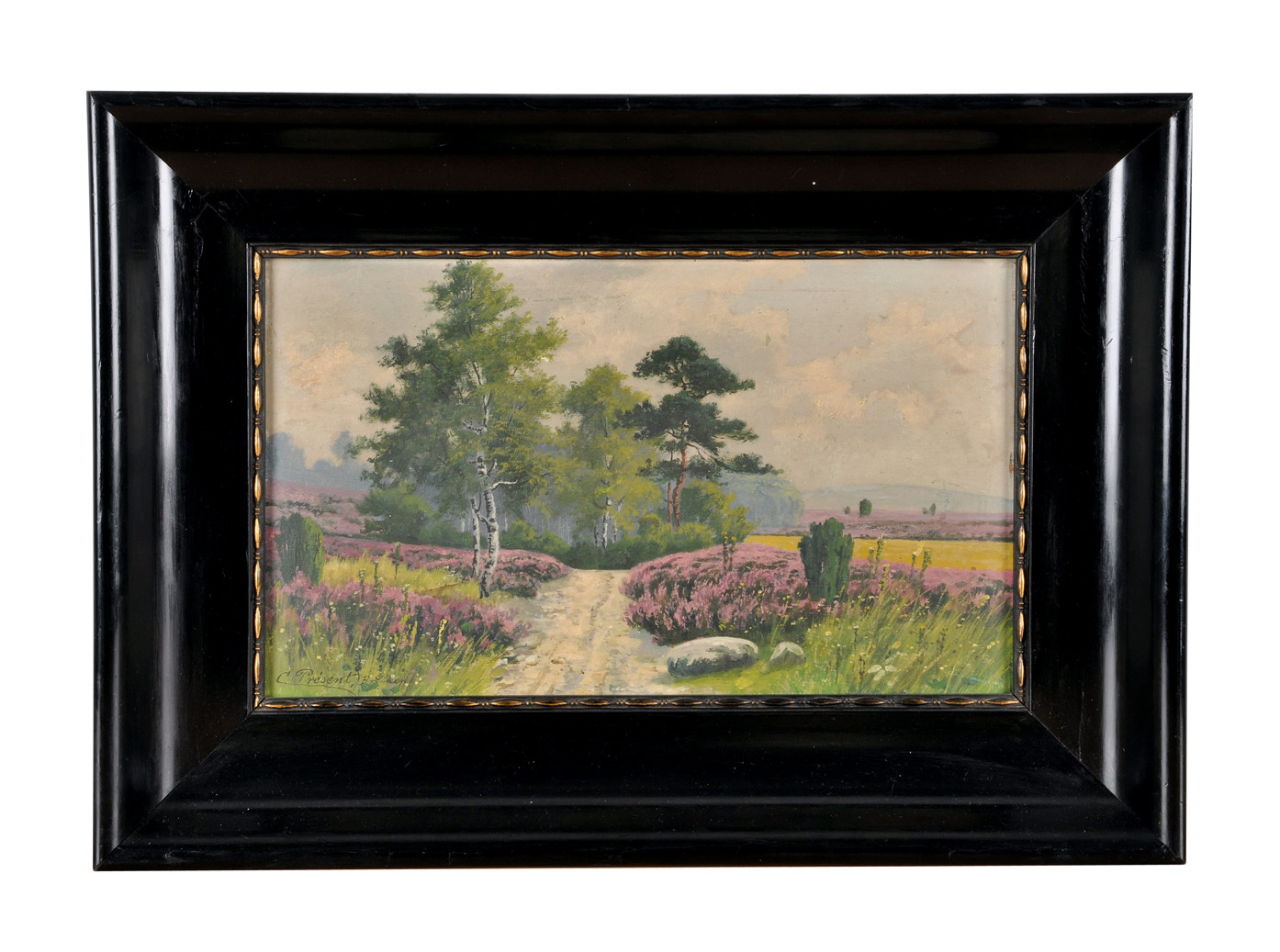 325529. SIGNIERT C. PRESENT, BREMEN. Blommande ljung. pianolack ram.
