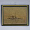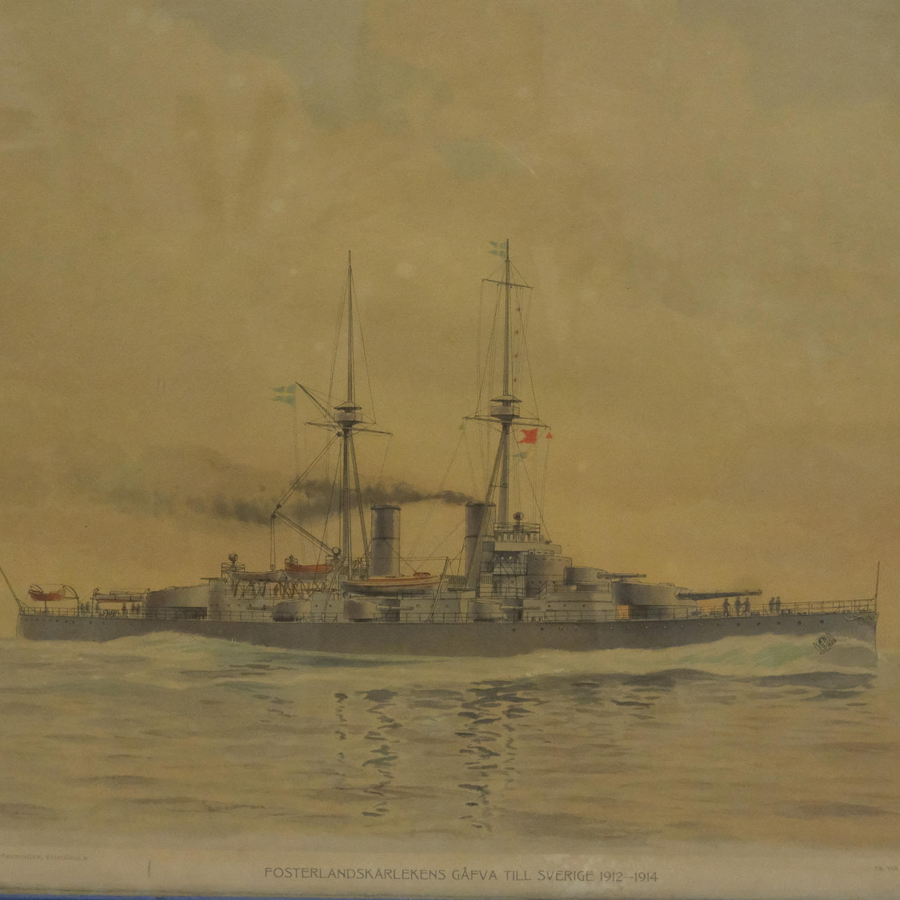 Motiv med pansarskeppet "Sverige/F-Båten. Signerad och daterad 1912. Märkt Tr. vid Generalstabens litogr. anstalt, Sthlm 1912.