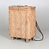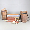 Två träkar, bärkont, tvättkorg, lockask, fröspridare, piedestal i rotting/glas. Högsta höjd 69 cm. Tävttkorg, längd 80 cm.